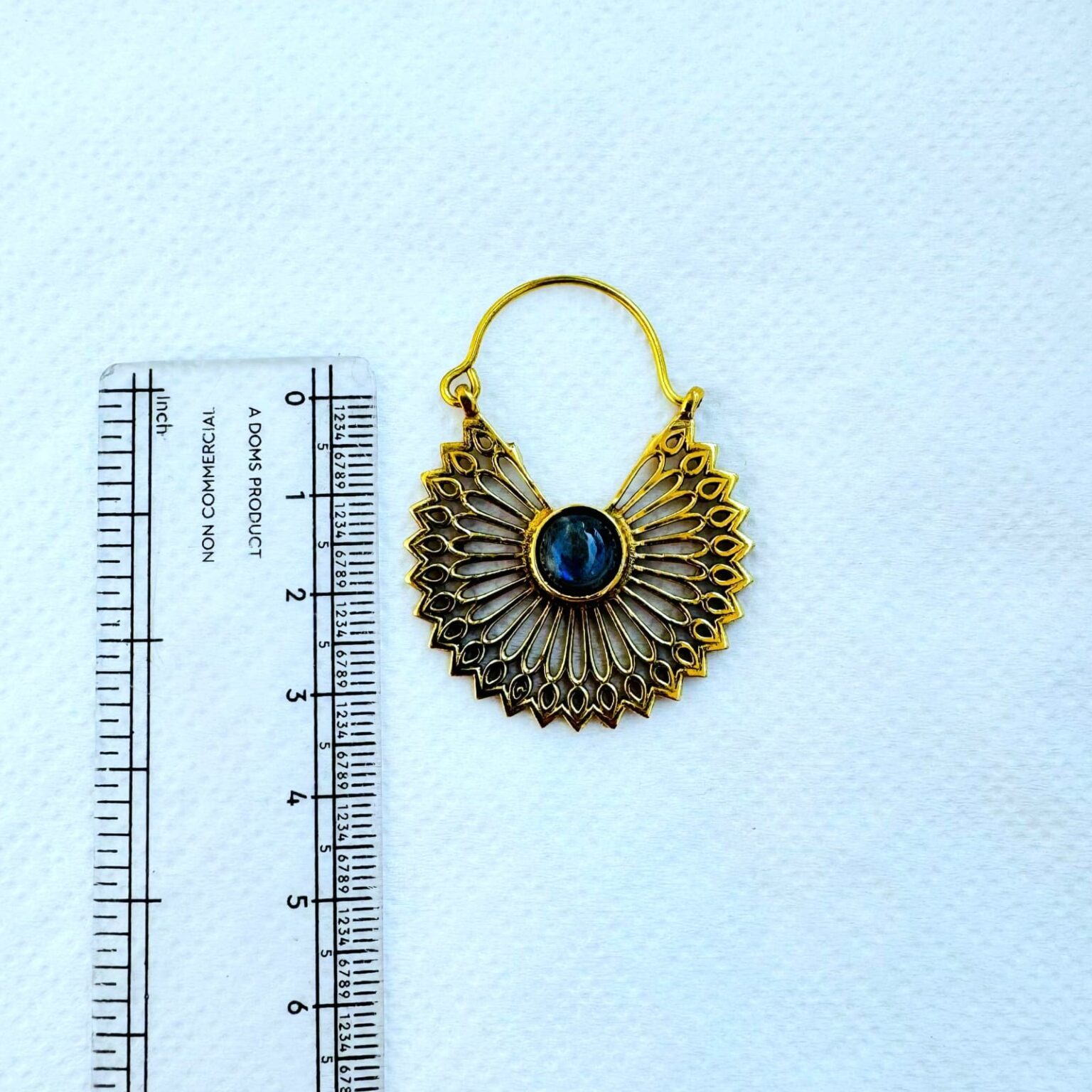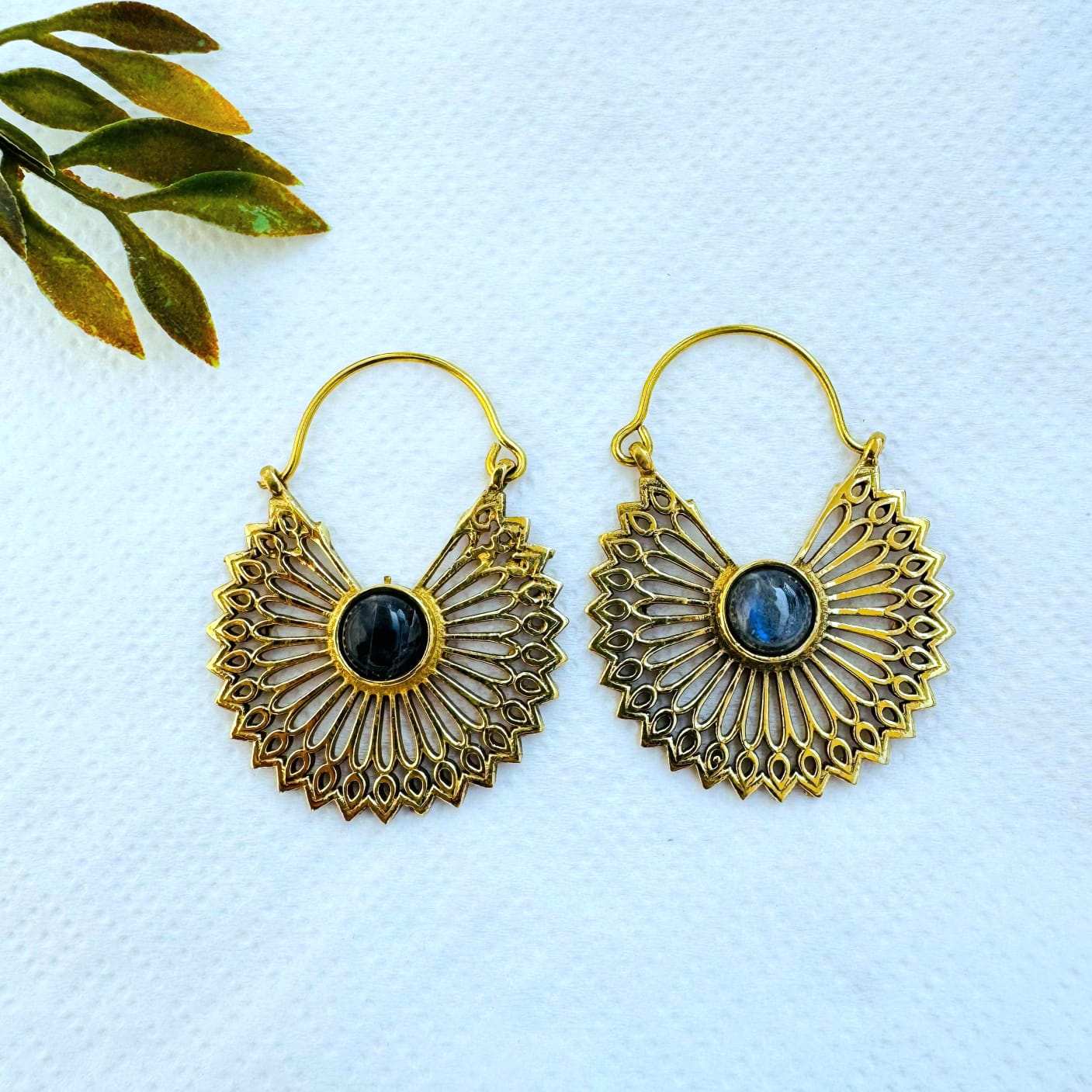 These handcrafted brass sunburst earrings showcase an eye-catching fan-shaped design inspired by solar motifs and traditional ornamentation. Fine openwork rays spread outward from a polished blue stone center, creating a striking balance between strength and elegance.