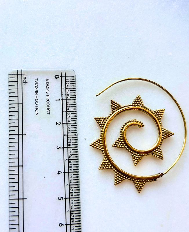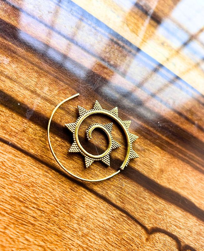 Radiate bohemian charm with these Brass Spiral Sun Hoop Earrings. Crafted in a unique spiral pattern with sun ray details, these hoops make a bold statement inspired by nature and sacred geometry.
