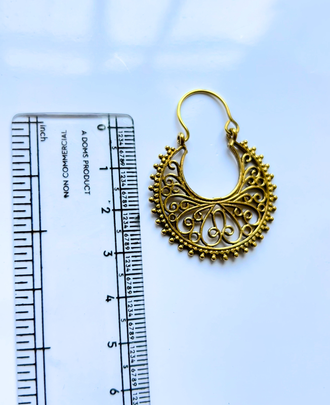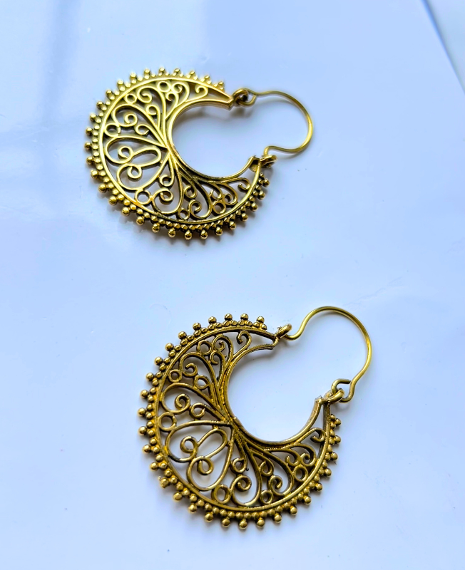 These bold crescent-shaped earrings are crafted in an antique gold-tone brass finish and feature exquisite filigree detailing with delicate beaded edges. Designed to make a statement, these earrings blend vintage charm with a handcrafted tribal aesthetic.