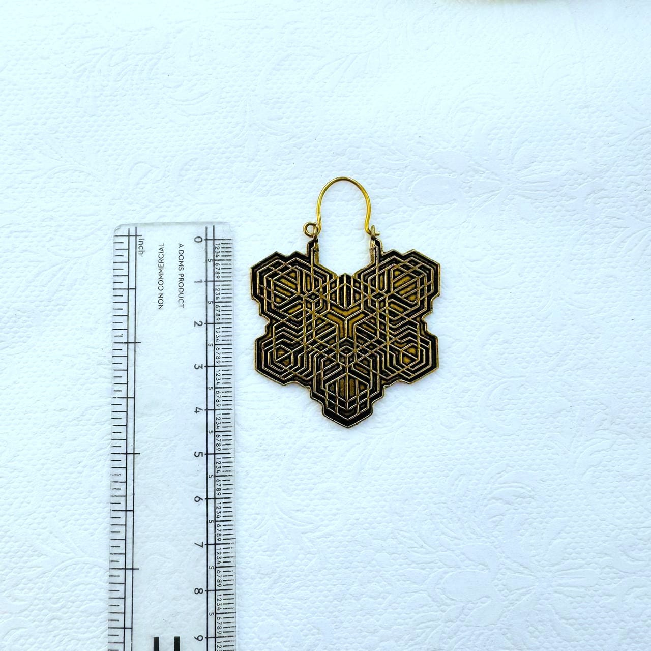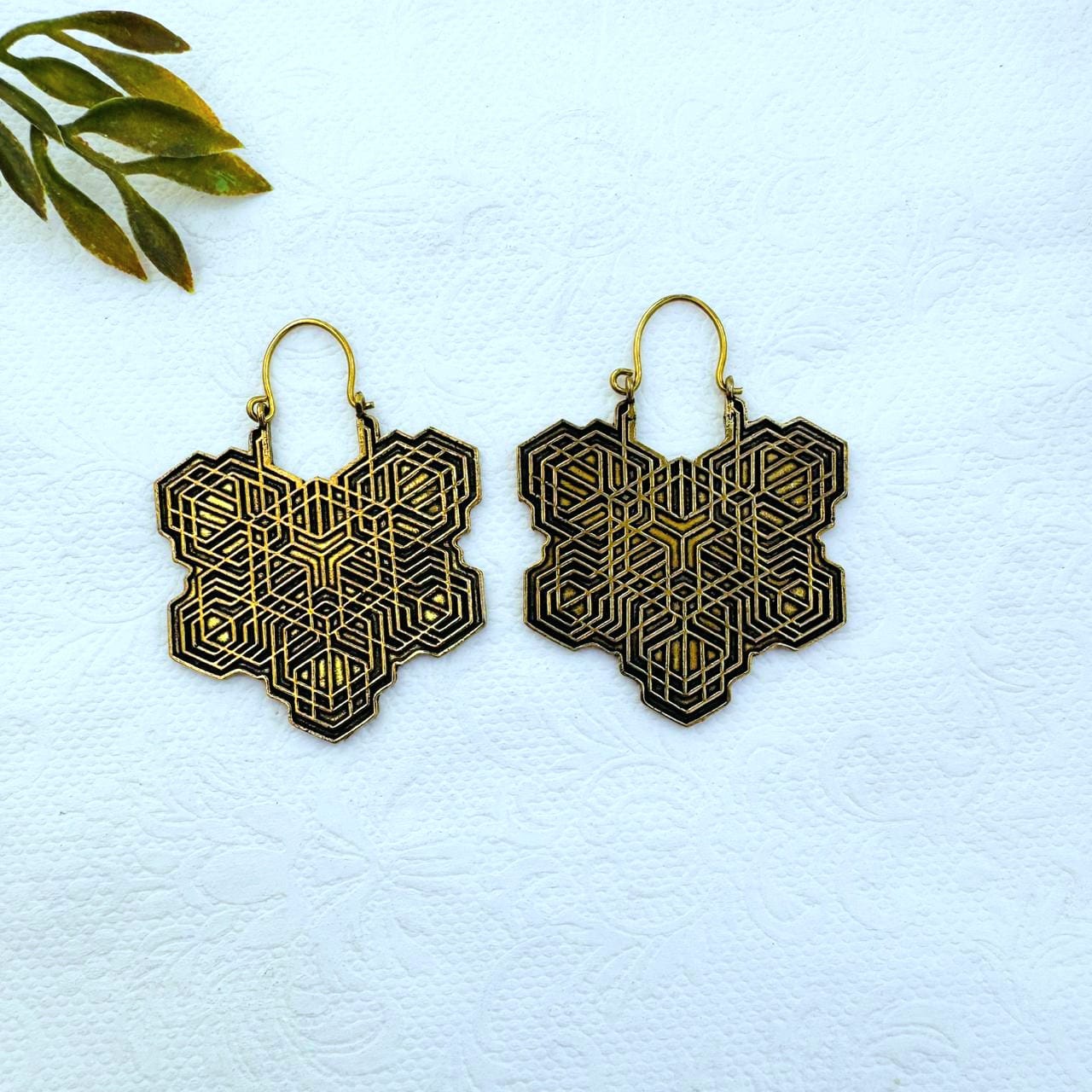 These brass earrings showcase a striking geometric pattern inspired by sacred geometry and architectural symmetry. The layered openwork design creates depth and visual rhythm, while the bold shape gives the piece a strong, modern presence balanced with an ancient, symbolic aesthetic.