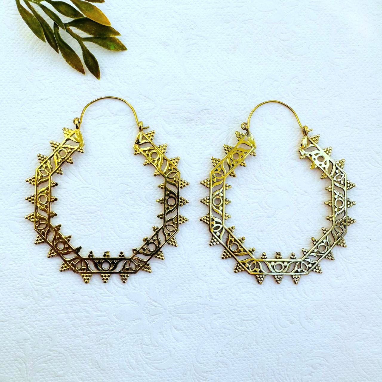 These crescent brass hoop earrings are a striking statement piece, combining traditional craftsmanship with a bold, contemporary silhouette. The openwork crescent form is adorned with rhythmic cutout patterns and raised bead accents along the outer edge, creating depth, texture, and visual movement.