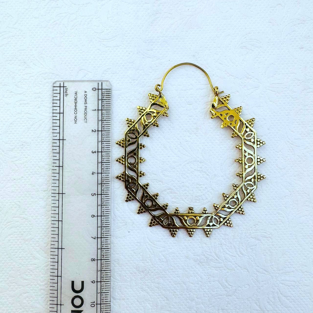 Handcrafted gold plated brass earring featuring an intricate design with a cutwork and textured bead detailing. Lightweight and perfect for a bold yet elegant look.