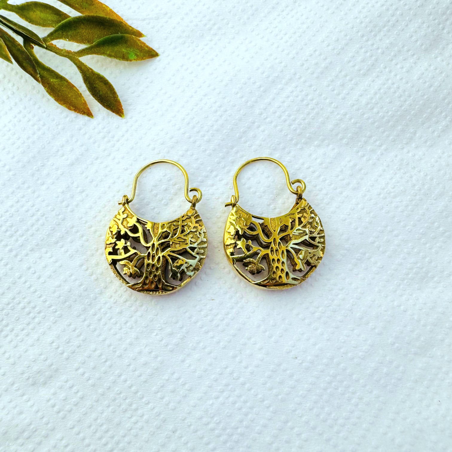 These handcrafted brass earrings showcase a beautifully detailed Tree of Life motif set within a rounded hoop shape. The intricate cut-out branches and textured trunk symbolize growth, strength, and connection, making these earrings both meaningful and visually striking.