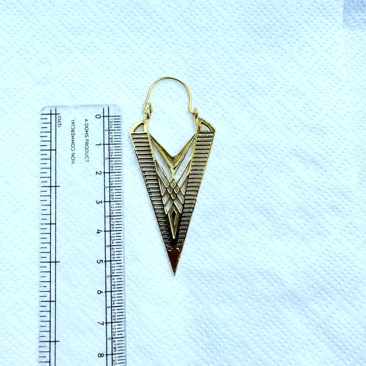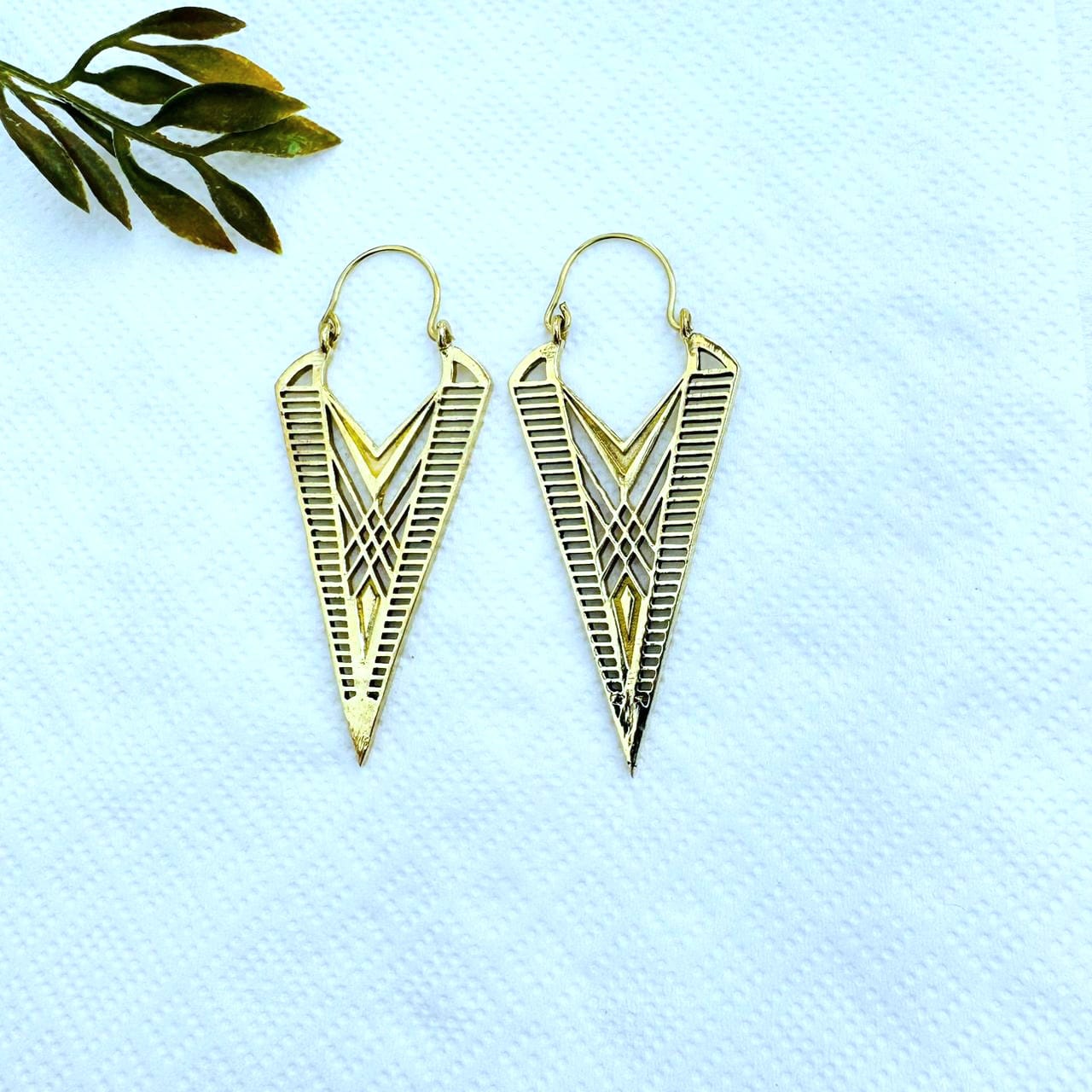 These tribal arrow brass earrings feature a dramatic elongated V-shape inspired by ancient symbols and geometric patterns. The layered cut-out design and textured lines create depth while maintaining a clean, balanced look.