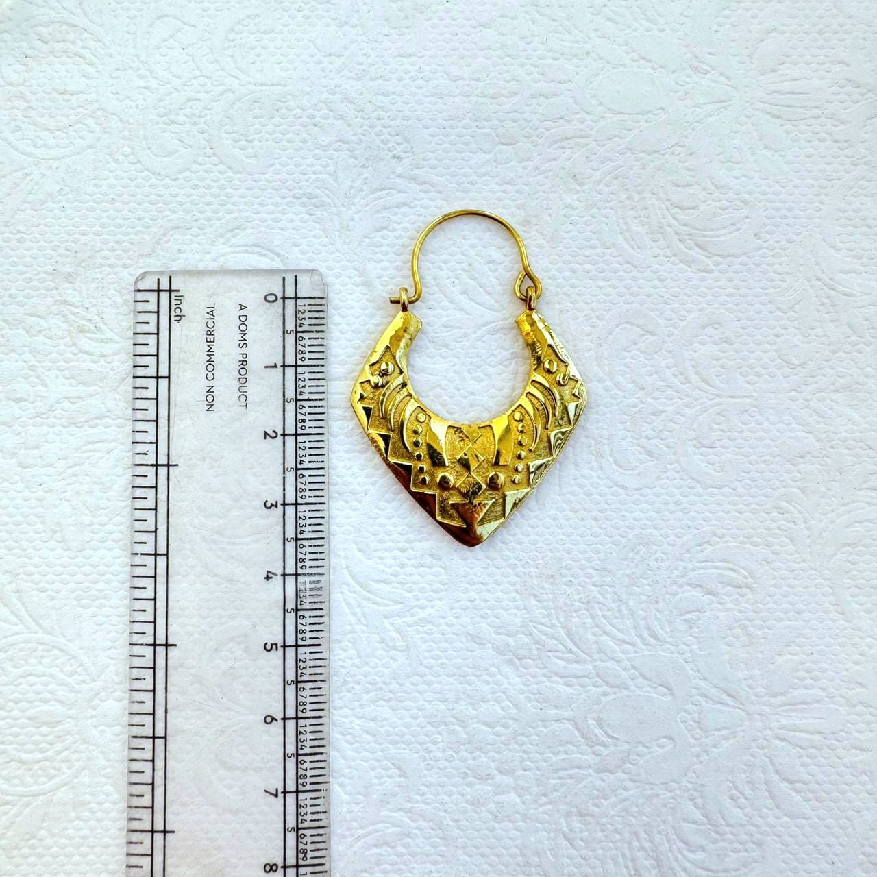 Handcrafted gold plated brass earring featuring an intricate design with a geometric tribal engravings and raised dot details. Lightweight and perfect for a bold yet elegant look.