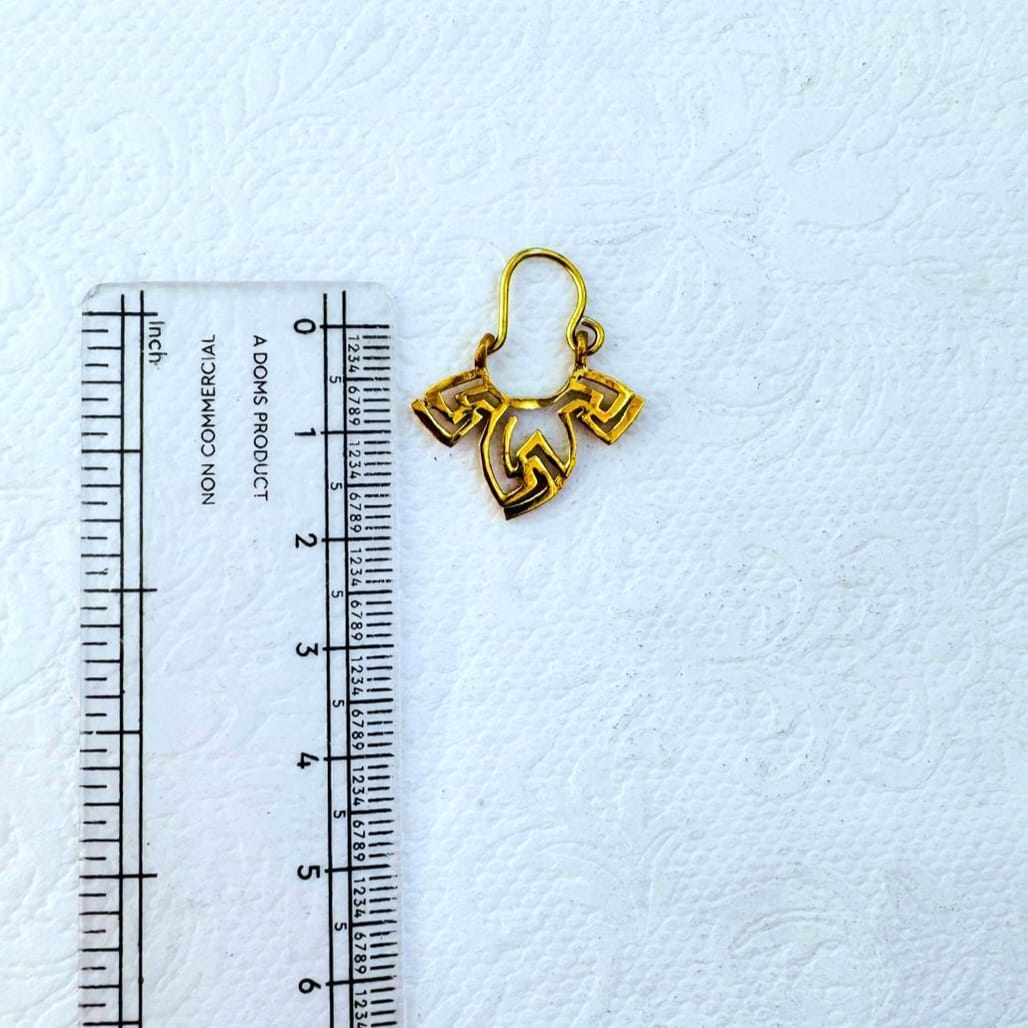 These striking earrings feature a complex geometric pattern inspired by traditional tribal symbols. The open work brass design creates a beautiful play of light and shadow, making them a standout accessory for any jewelry collection.