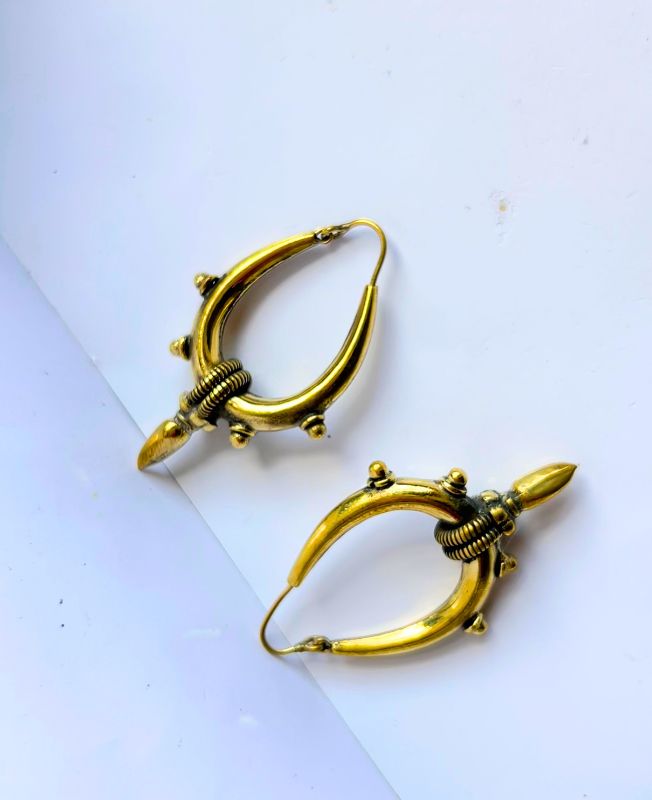 Vintage-style brass earring featuring a curved spike design with intricate wire wrap and ball accents, inspired by traditional tribal aesthetics.