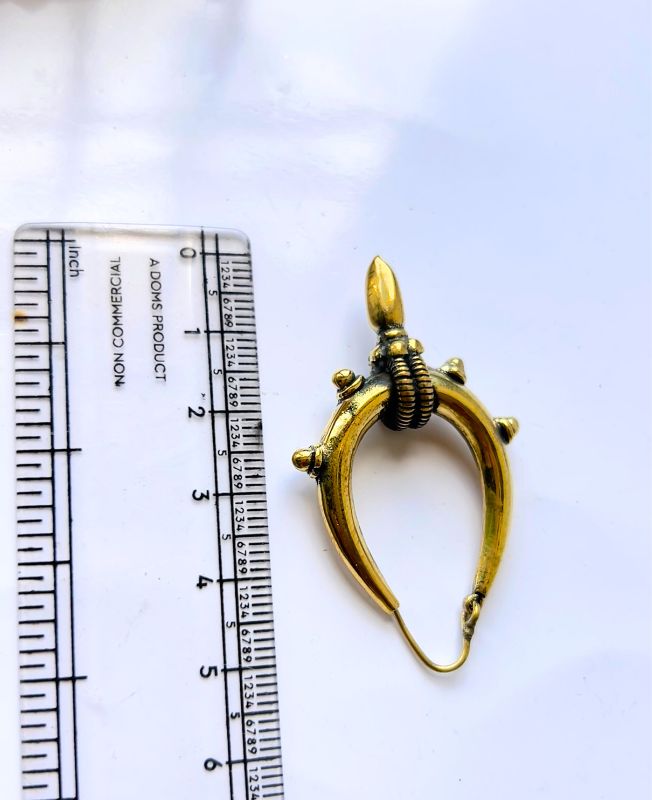 This striking antique brass earring showcases a unique horseshoe shape, embellished with tribal-inspired details including fine wire wrapping at the top and symmetrical spherical protrusions along the sides. Finished with a leaf-shaped finial and secure traditional hook closure, it embodies a rustic, ethnic charm perfect for boho-chic or heritage looks.