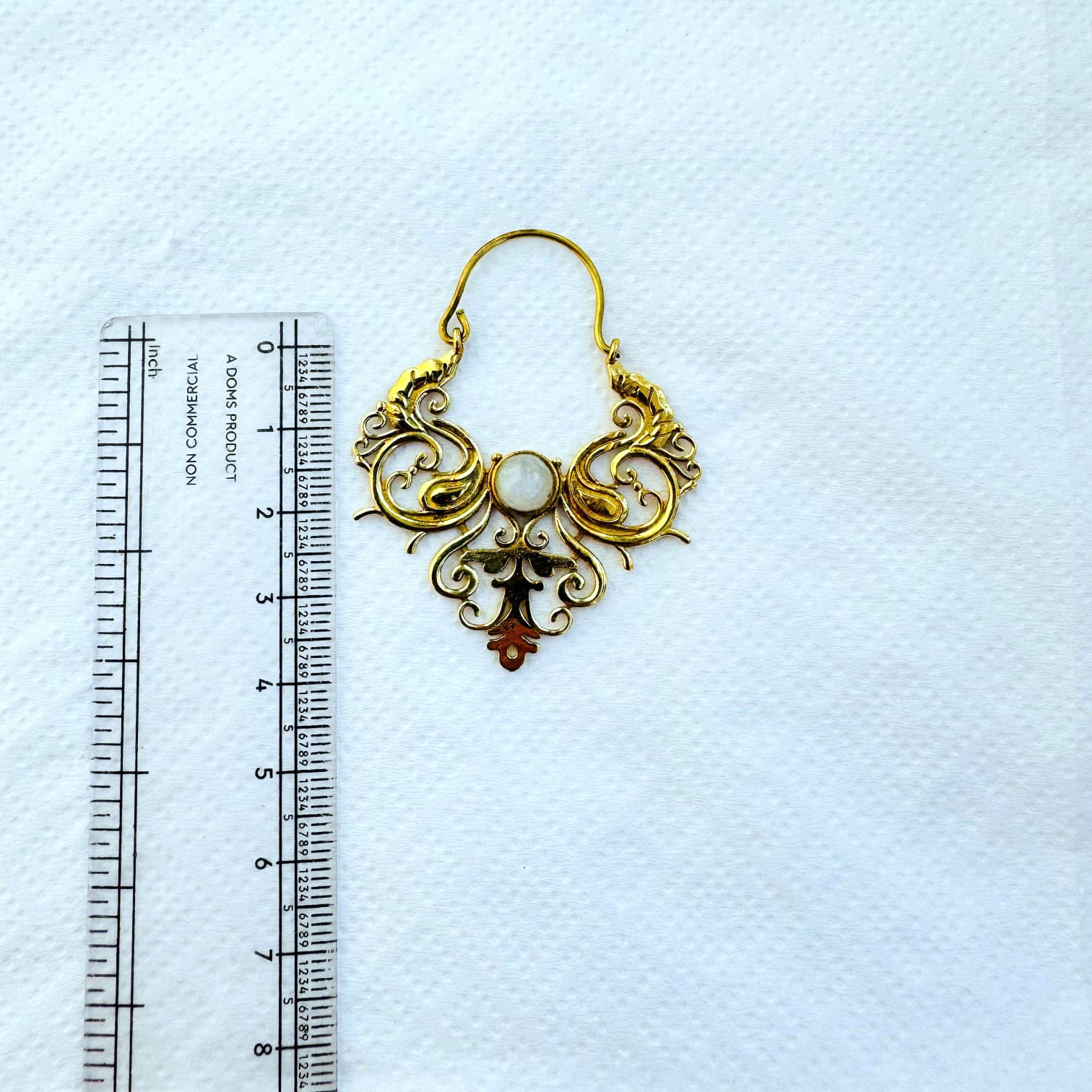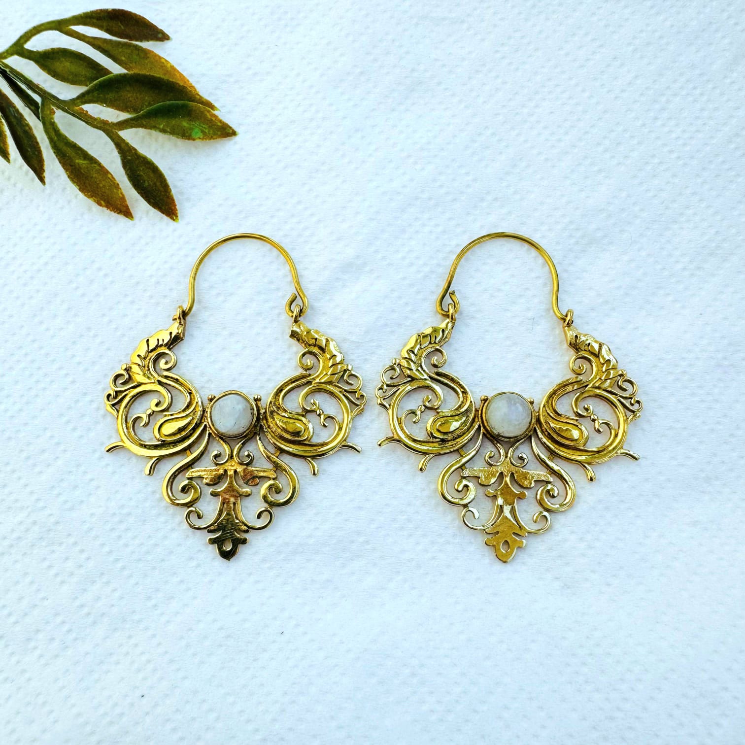 These exquisite brass filigree earrings showcase an intricate, symmetrical scrollwork design inspired by antique and Victorian-era ornamentation. The softly curved brass lines create a graceful, almost wing-like silhouette, centered around a natural white stone cabochon that adds light, balance, and elegance to the piece.