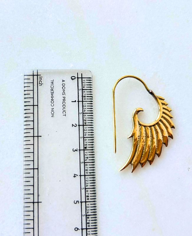 This exquisite brass earring features a stunning wing-inspired design, representing flight, protection, and higher perspective. Meticulously crafted with layered feather detailing, it combines an artistic boho aesthetic with timeless symbolism.