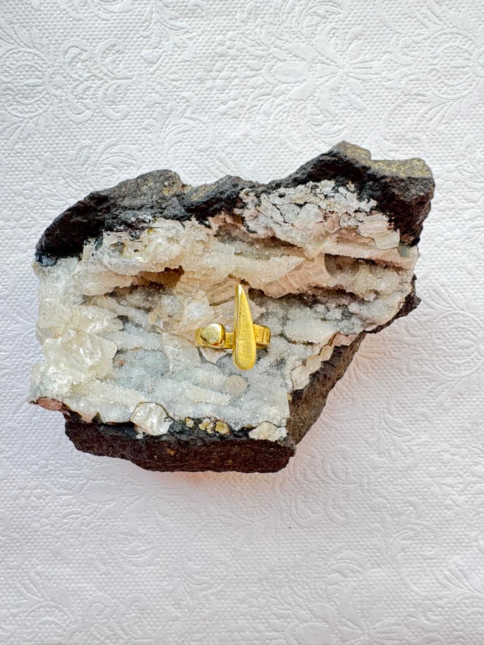 A contemporary brass ring featuring two sculpted geometric forms one round and one elongated that create a unique balance of texture and style. Perfect for minimalist and statement jewelry collections alike.