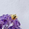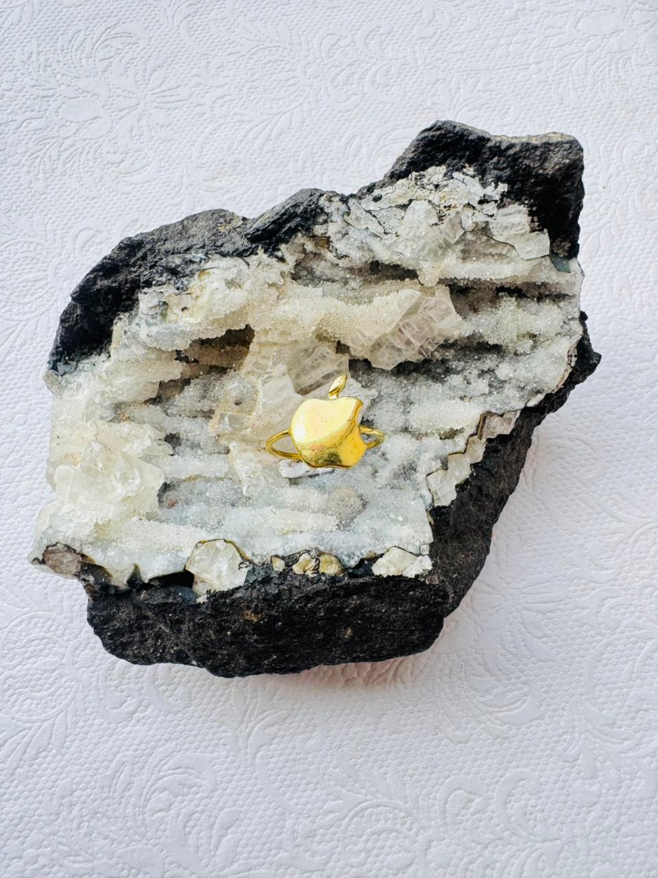 An adjustable gold colored ring featuring a polished, solid apple-shaped motif with a small leaf detail, resting on a purple amethyst crystal.