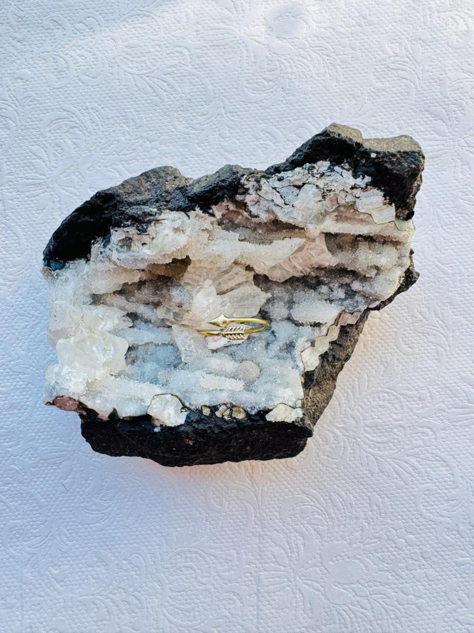 A gold colored bypass ring designed in the shape of a single arrow that wraps around the finger.