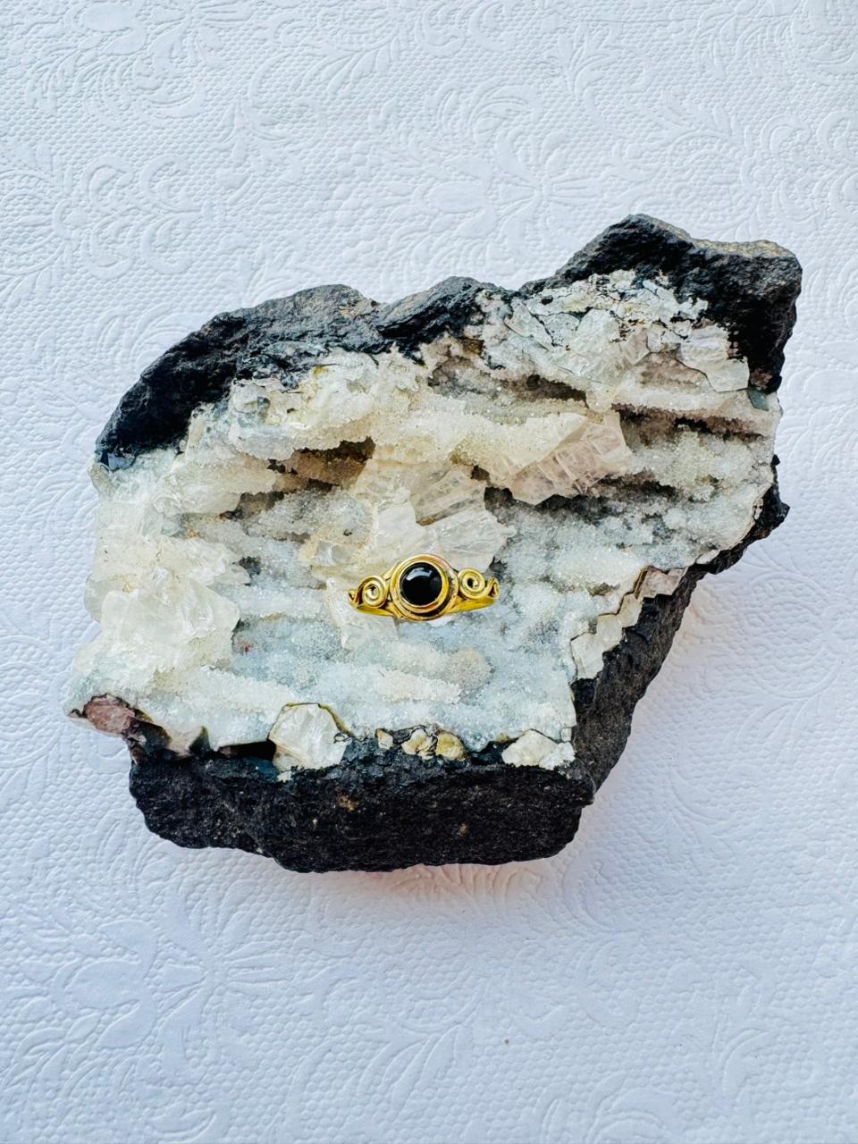 Elegant adjustable brass ring featuring a deep black onyx gemstone set within intricate handcrafted swirl detailing. A perfect fusion of bohemian and timeless style..