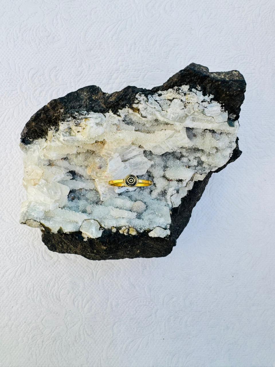 This jewelry piece is a minimalist gold-tone ring characterized by a small, geometric centerpiece. The focal point is a flat, circular disk adorned with a concentric circle or target motif. The design features a central dot surrounded by rings, with the recessed grooves darkened (likely with enamel or oxidation) to provide a sharp visual contrast against the bright yellow-gold metal.