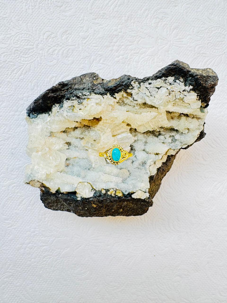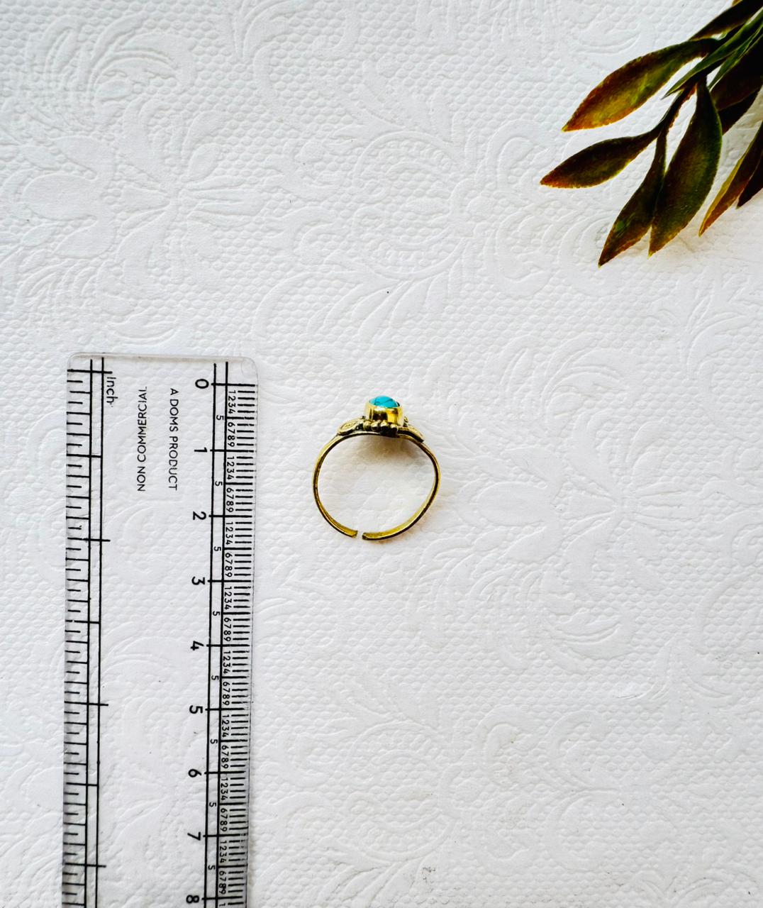 This handcrafted brass ring showcases a stunning turquoise gemstone set in a beautifully detailed brass frame. The design features soft curves and ornamental patterns that highlight traditional Indian craftsmanship. Each ring is carefully made to bring a unique touch of charm and individuality — no two are exactly alike.