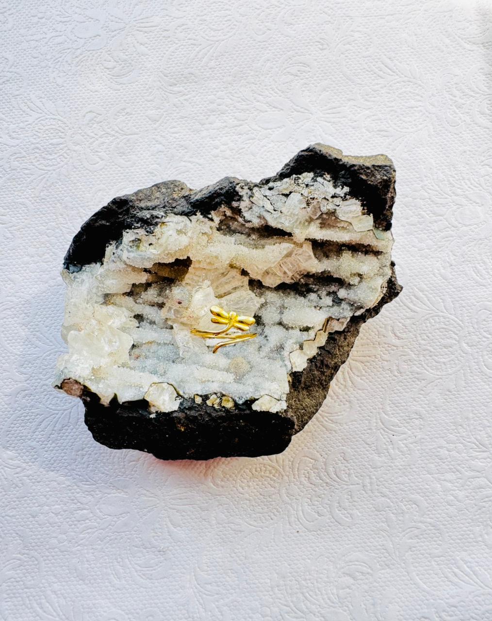 An adjustable gold-colored bypass ring featuring a polished sculptural dragonfly motif, resting on a purple amethyst crystal cluster.
