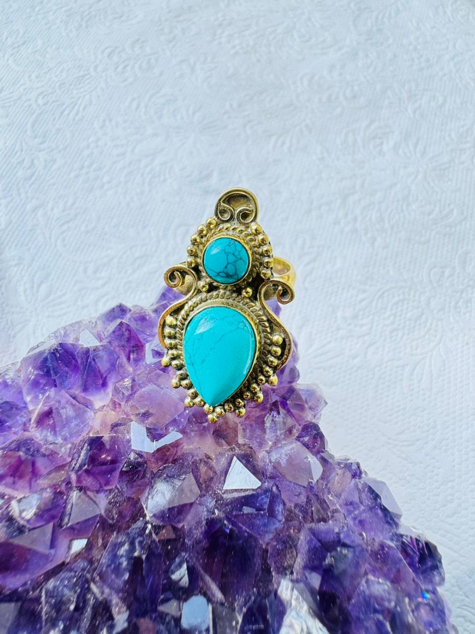 A vintage-style brass ring featuring two turquoise stones one round and one teardrop-shaped set within an ornate, beaded filigree frame and displayed on an amethyst crystal cluster.