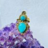 A vintage-style brass ring featuring two turquoise stones one round and one teardrop-shaped set within an ornate, beaded filigree frame and displayed on an amethyst crystal cluster.