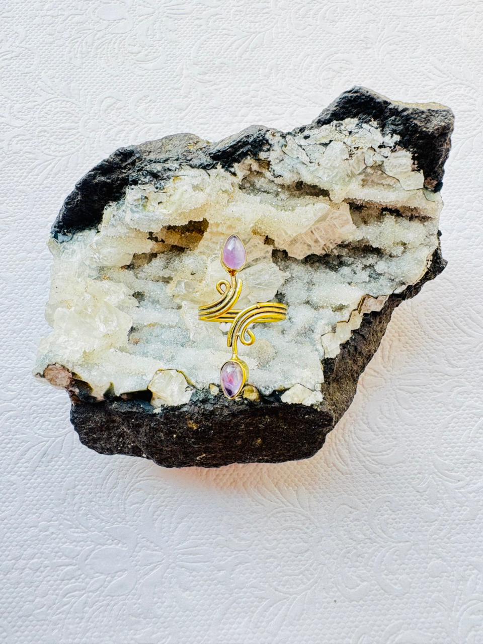Elegant handcrafted brass earrings featuring two natural amethyst stones set in a flowing spiral design. A perfect blend of boho charm and spiritual balance.