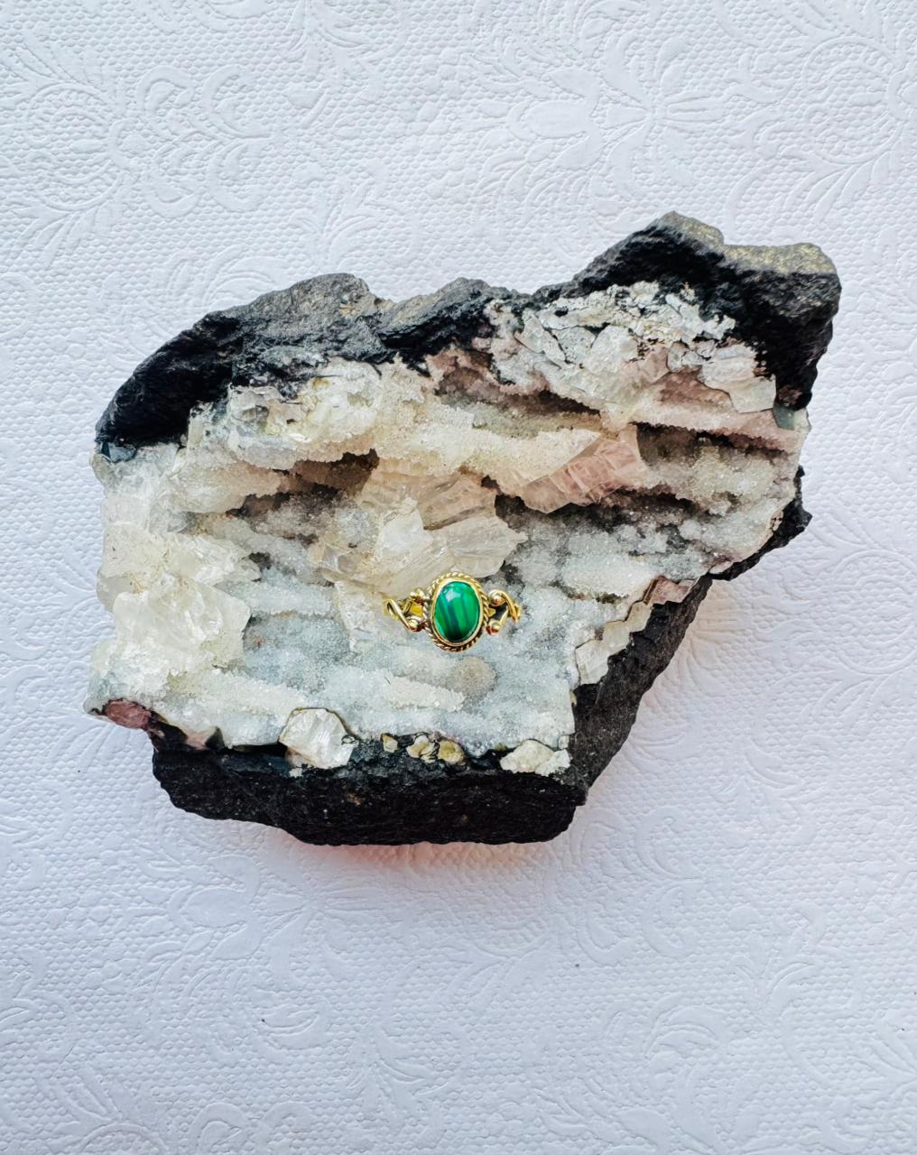 This elegant handcrafted ring showcases a vibrant green malachite gemstone set in intricately detailed brass. Each piece is artisan-made, highlighting the natural beauty of the stone’s deep green bands. The open-back adjustable design ensures a comfortable fit for all sizes, making it both stylish and practical.