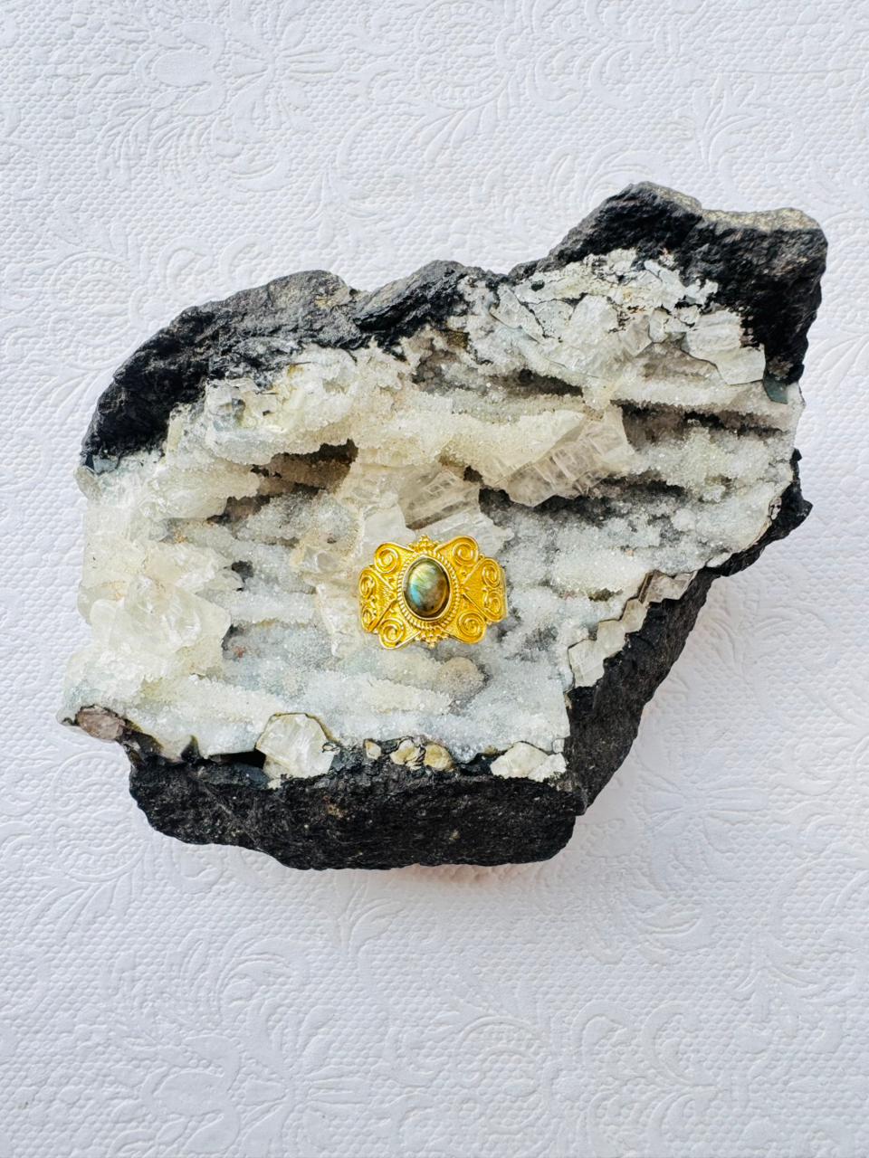 An adjustable gold-colored ring featuring a central oval labradorite cabochon with blue-green flashes, set within an ornate filigree band and displayed on a purple crystal.