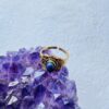 An adjustable gold-colored ring featuring a central oval lapis lazuli cabochon framed by ornate filigree scrollwork, resting on a purple amethyst crystal cluster.