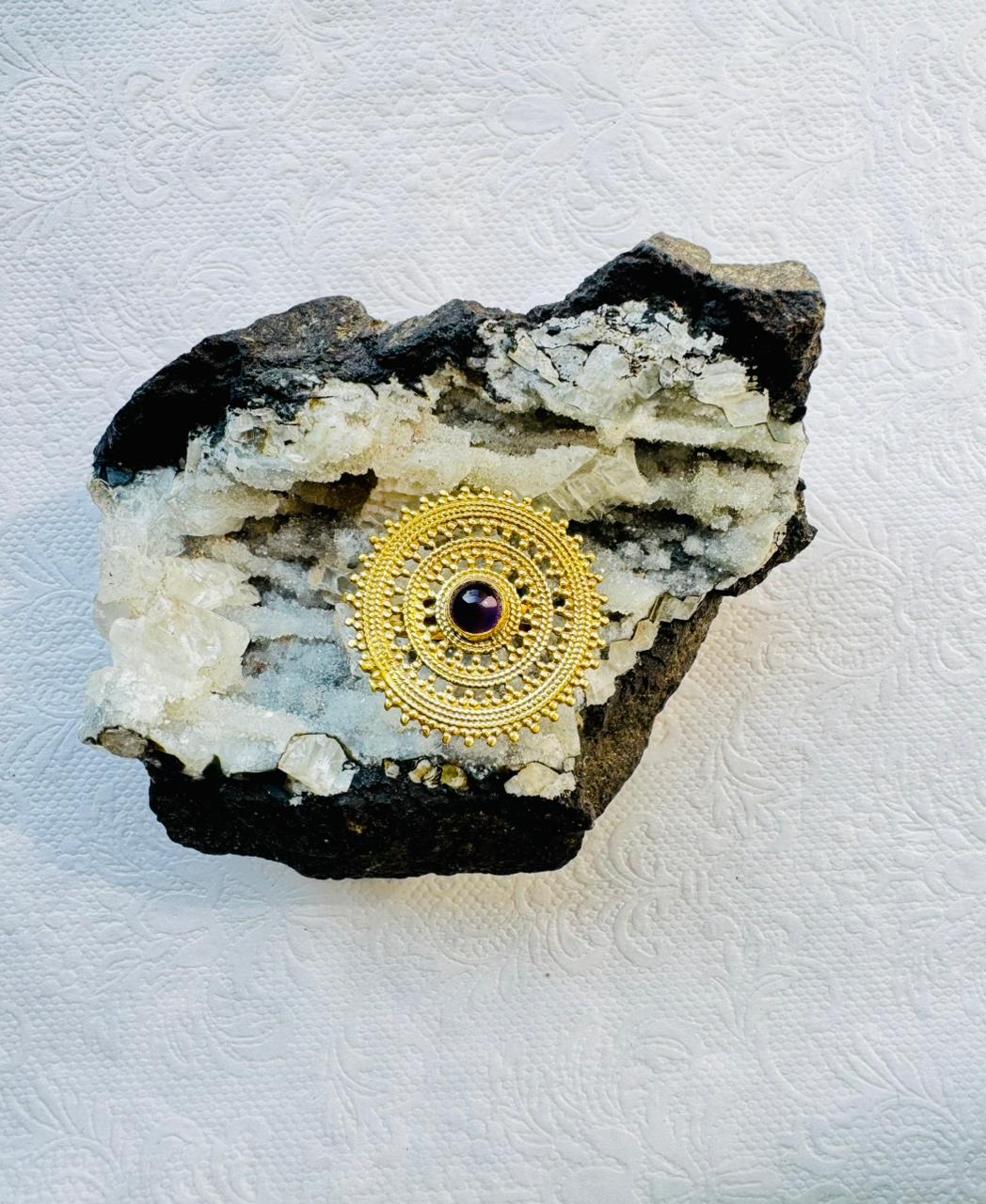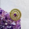 A large, circular gold-colored mandala-style ring featuring intricate filigree work and a central purple amethyst cabochon.