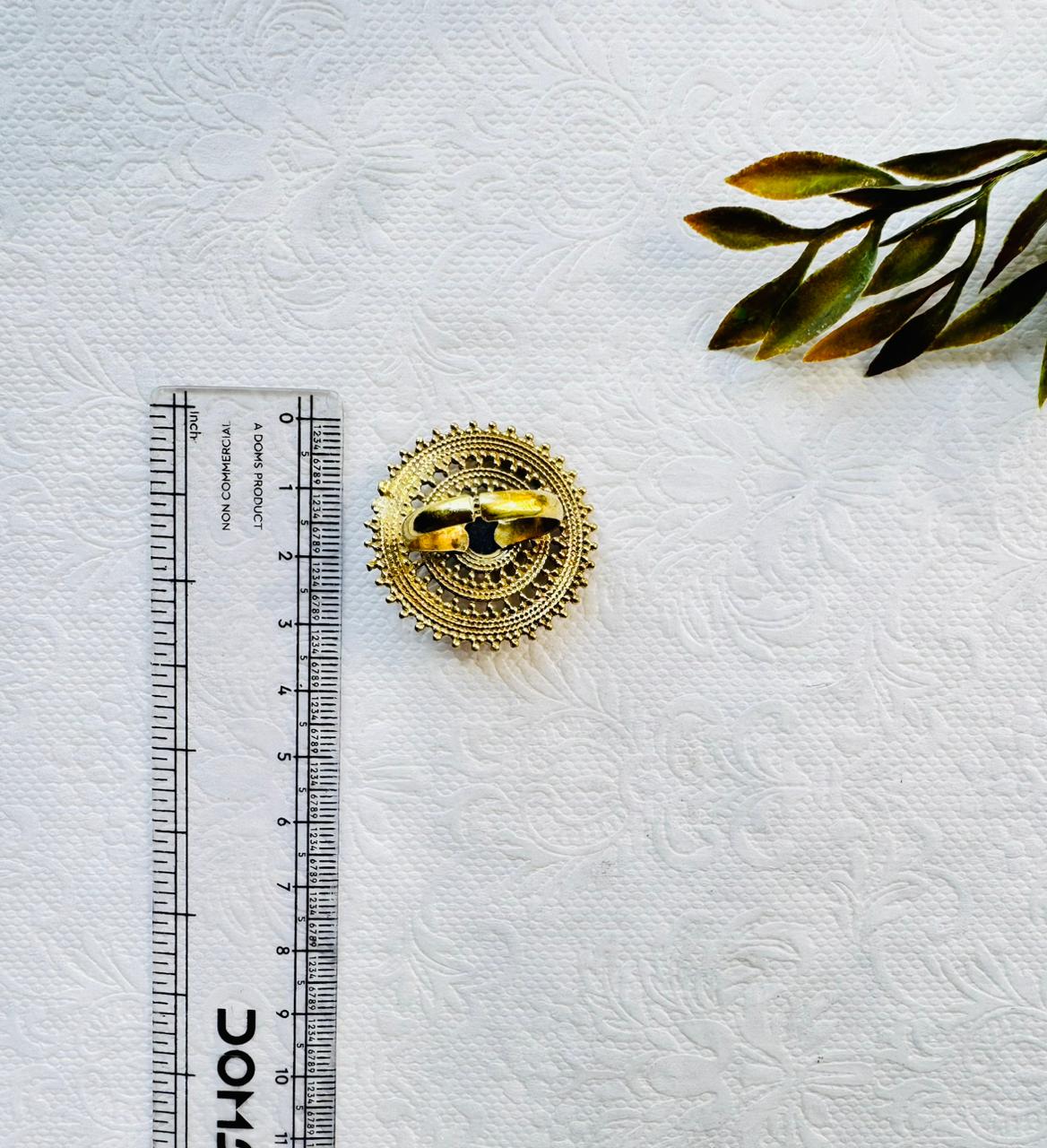 This statement ring features a wide, circular face designed in an ornate mandala or sunburst pattern. The metalwork consists of several concentric layers of textured gold-tone beads and delicate openwork filigree. The outermost edge is finished with a series of small, protruding metallic points that create a scalloped, sun-like effect.