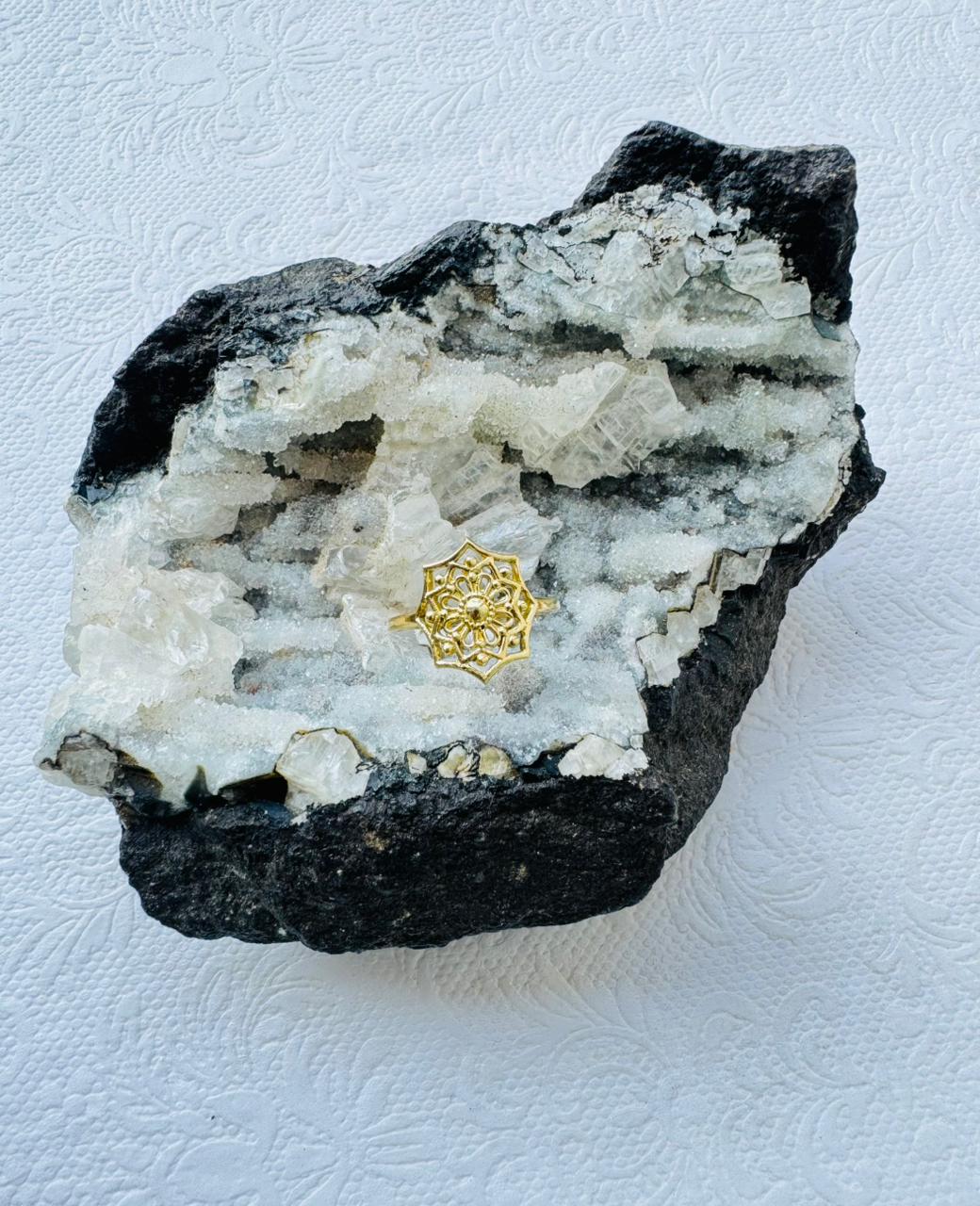 Handcrafted mandala flower brass ring detailed and elegant, symbolizing harmony and balance.
