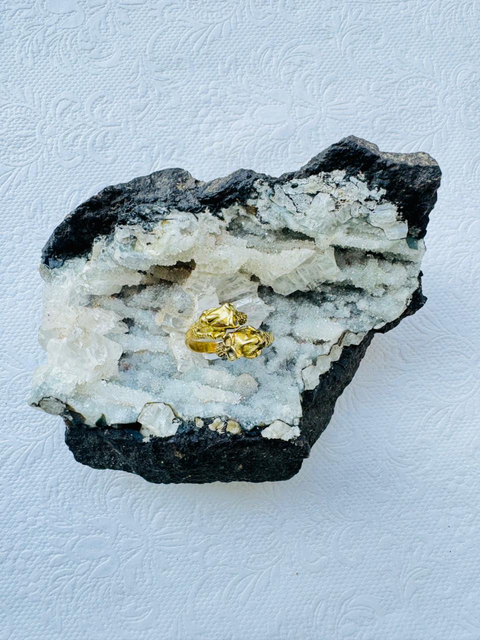 A bold gothic inspired wrap ring featuring a detailed skull and skeletal hand design in polished brass.
