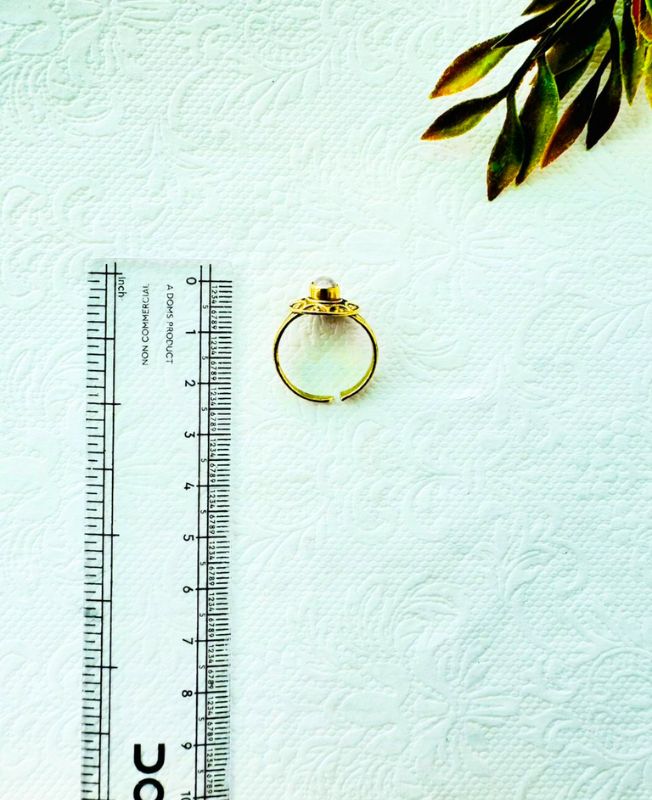 Elegant handcrafted brass ring featuring a crescent moon design with a central moonstone cabochon. Adjustable open back band for a perfect fit and celestial charm.