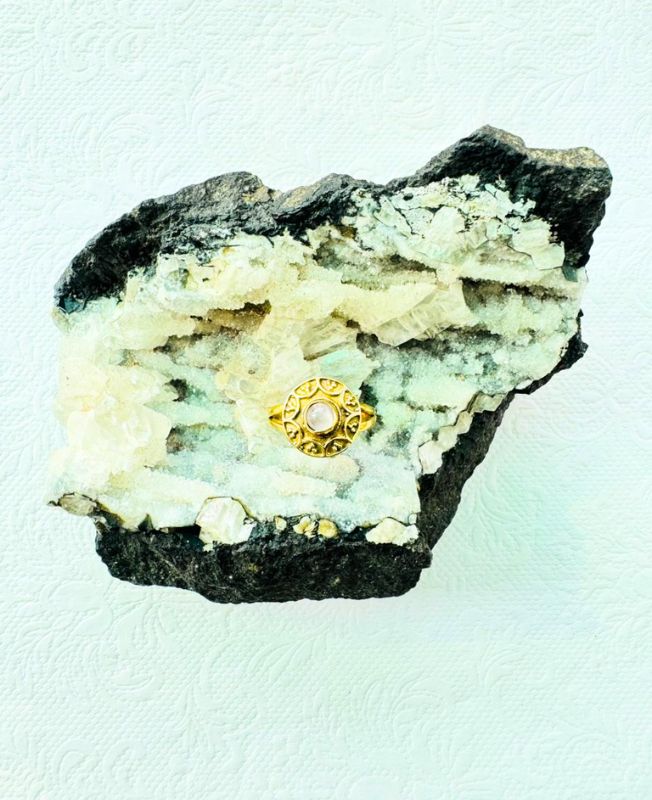 This stunning Brass Crescent Moon Ring with Moonstone combines celestial beauty with timeless craftsmanship. The ring features a smooth round moonstone set at the center of a detailed crescent moon motif, symbolizing intuition, femininity, and renewal. Each piece is meticulously handcrafted from solid brass, giving it a warm golden tone that complements the ethereal glow of the stone.