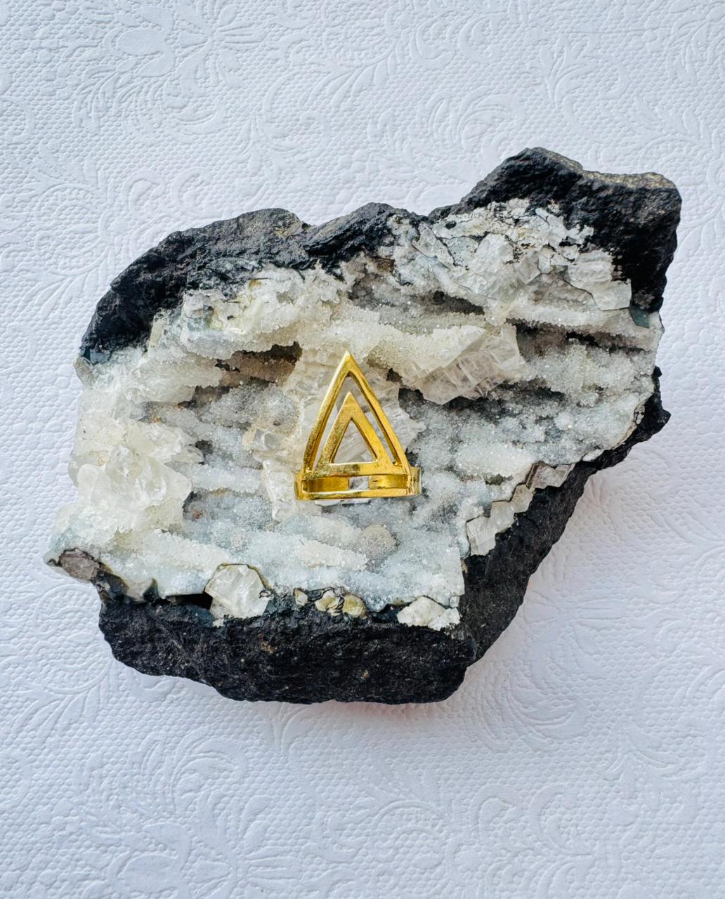 This jewelry piece is a gold-tone ring with a prominent geometric focal point. The design features a large outer triangle with a smaller, solid-looking triangle nested within its lower half, creating a layered architectural effect. The triangles are mounted on a wide, polished band that appears to have an adjustable open-shank design at the back. The metal has a bright, yellow-gold finish with smooth, reflective surfaces. In the image, the ring is displayed atop a jagged purple amethyst crystal cluster, which provides a sharp color contrast against the metallic gold of the ring.