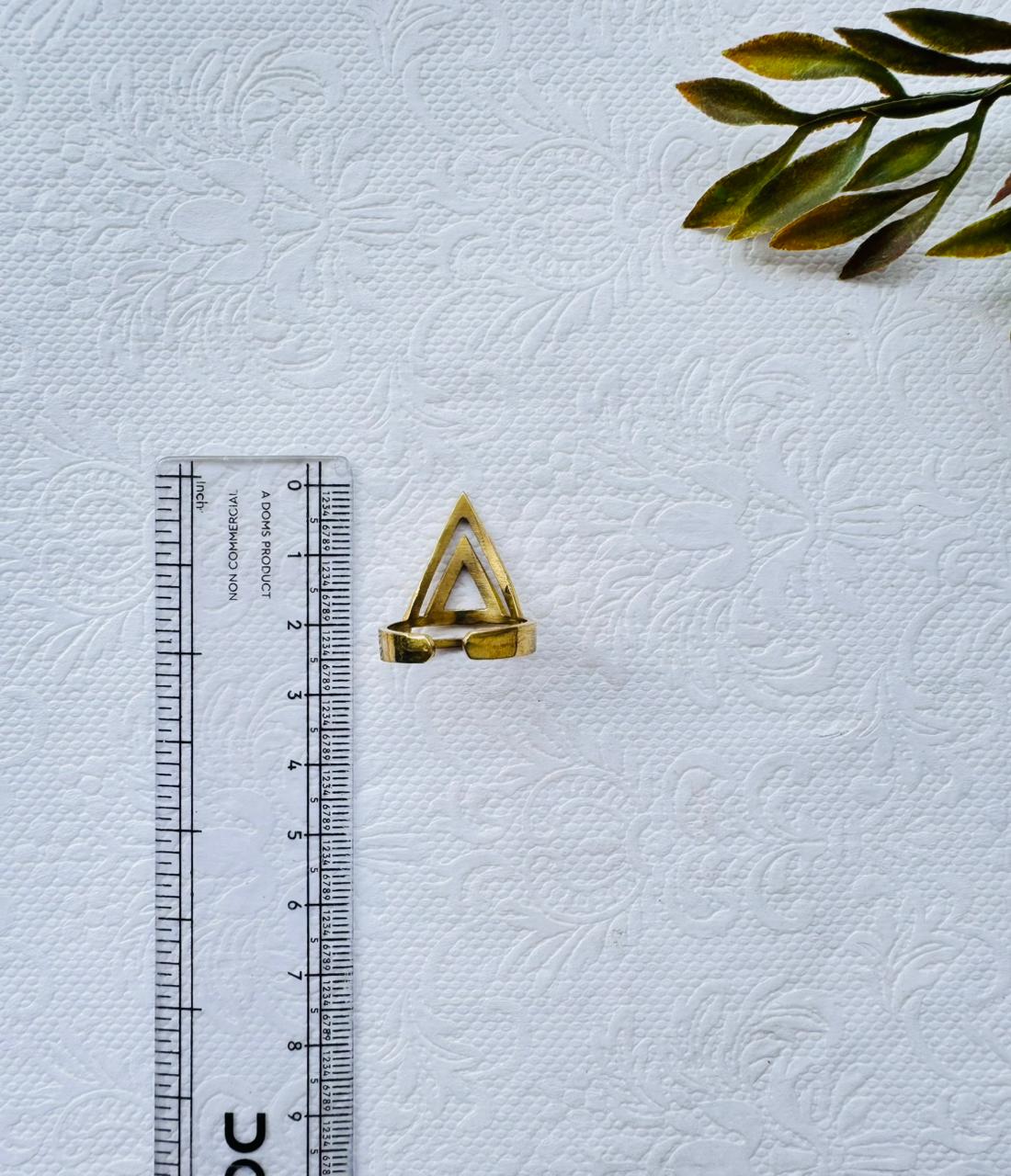 An adjustable gold colored ring featuring a bold, geometric design with two nested triangles of different sizes.