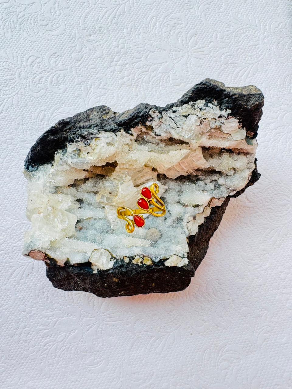 This beautifully handcrafted brass ring showcases two vibrant red heart stones set in an artistic open swirl design. The brass base gives it a timeless golden glow, while the rich red tones add warmth and passion. Each piece is artisan-made, ensuring unique charm and craftsmanship.