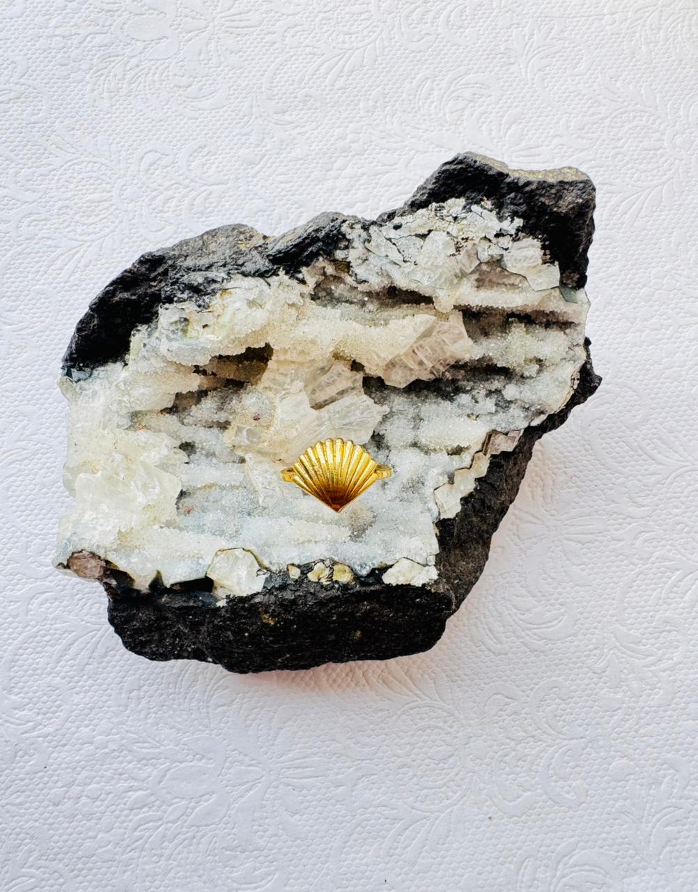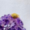 A polished gold-colored ring featuring a sculptural scallop shell motif with prominent vertical ribbing, perched on a purple amethyst crystal.