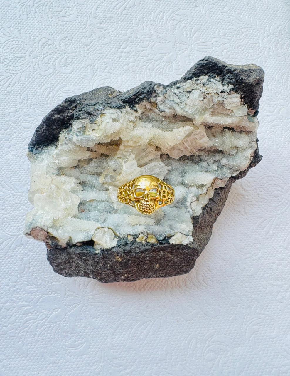 This striking brass skull ring combines detailed craftsmanship with a touch of mystique. Cast in solid brass, the openwork skull design is enhanced with vivid purple stone inlays that catch the light beautifully. The ring’s band is adjustable, allowing for a comfortable fit on various finger sizes.