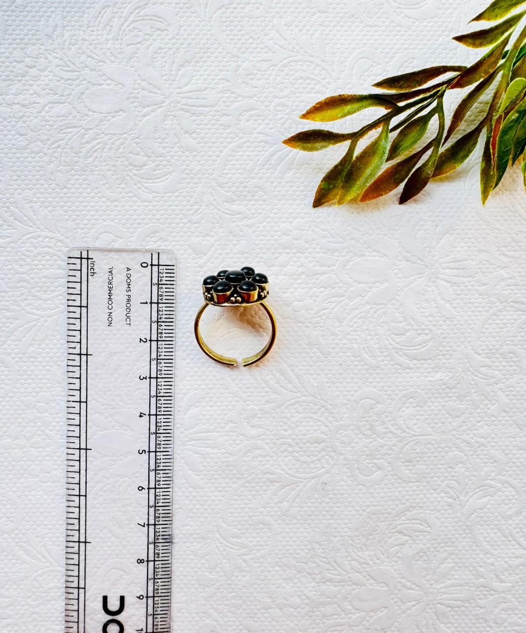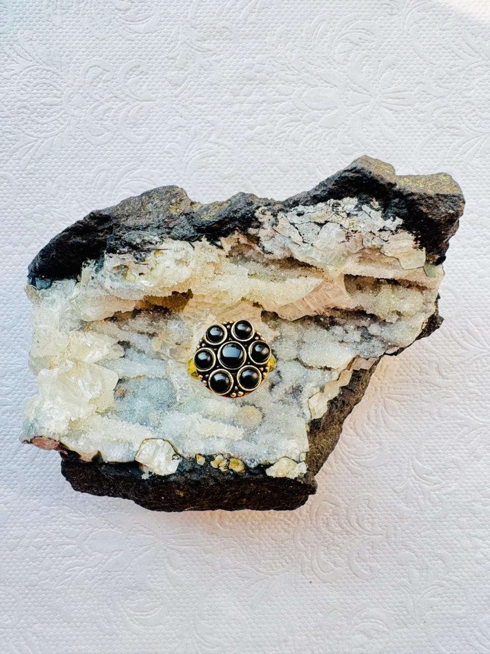 Bold and elegant brass ring featuring a cluster of black onyx stones. Perfect for statement jewelry lovers and bohemian styles.