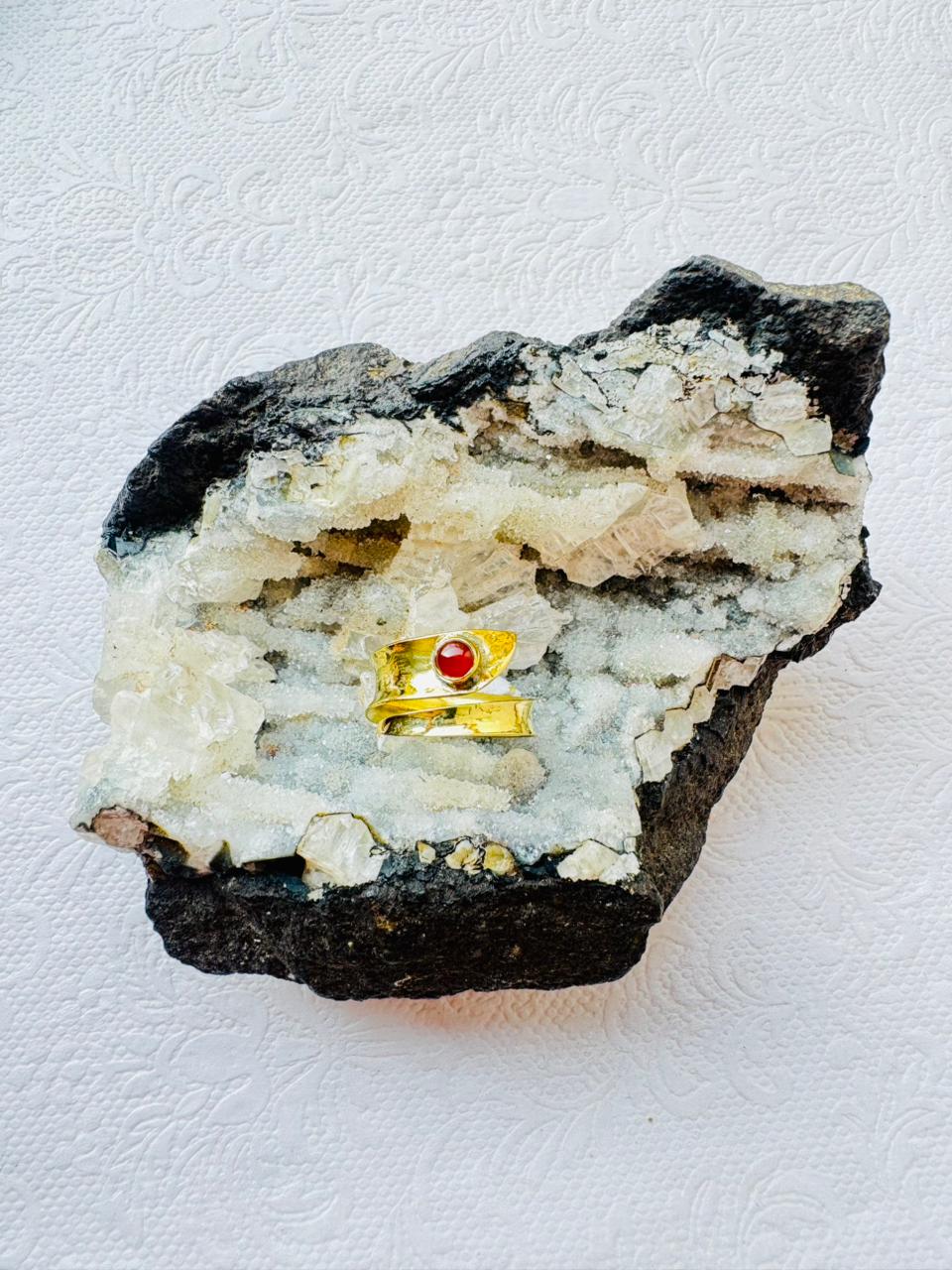 Elegant handcrafted brass ring featuring a deep red natural stone centerpiece. Its open adjustable design ensures a perfect fit, combining timeless style with artisan craftsmanship.