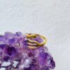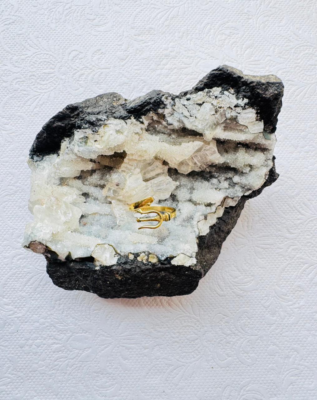 An adjustable gold-colored bypass ring featuring a polished trident motif on one end and a smooth tapered tip on the other, resting on a purple amethyst crystal.