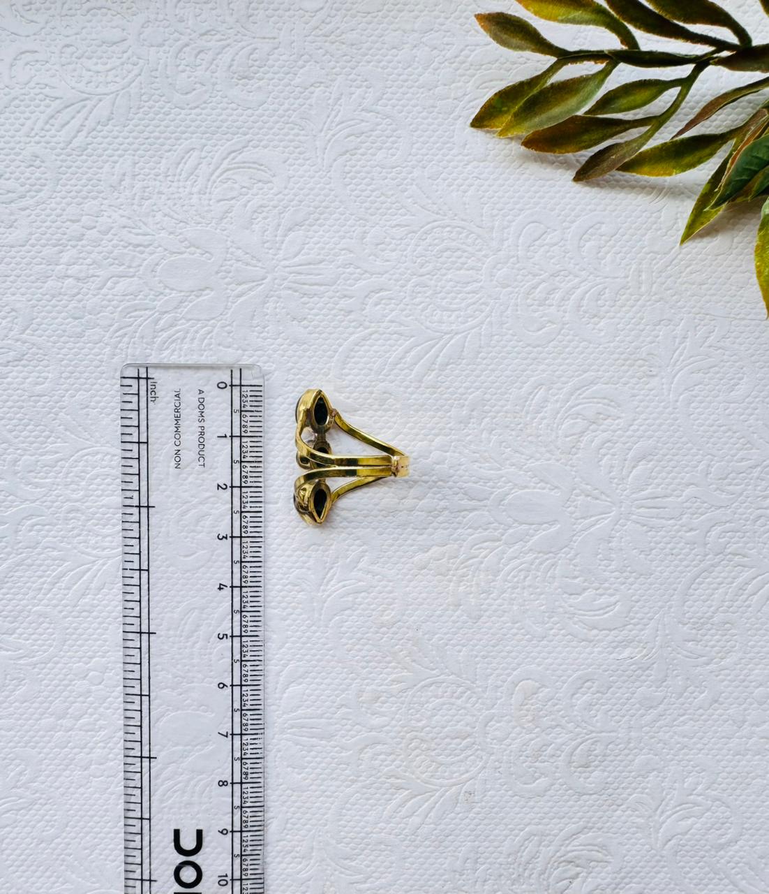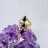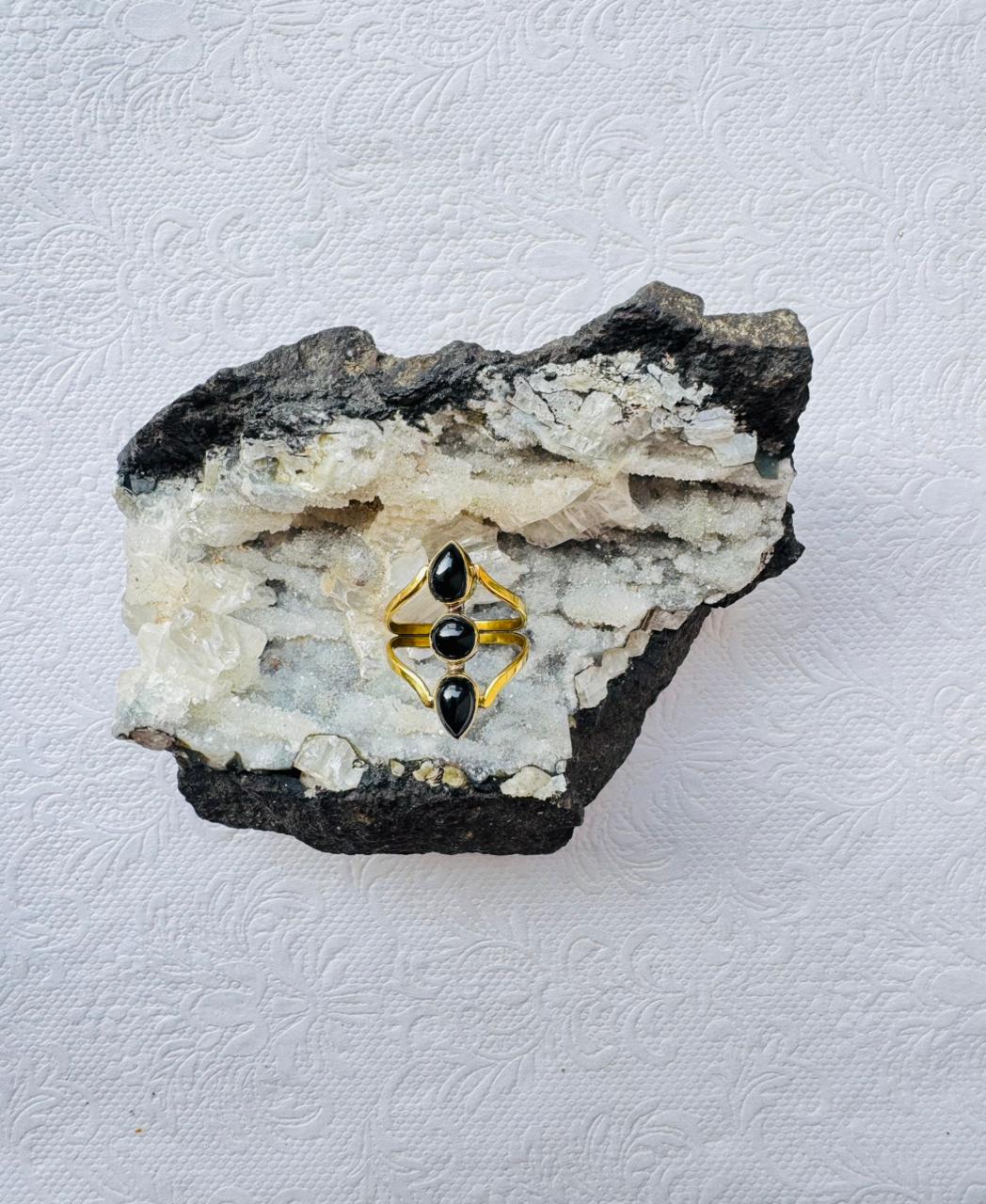 An adjustable gold colored ring featuring three vertically aligned black stones two teardrop shaped and one round resting on a purple amethyst crystal.