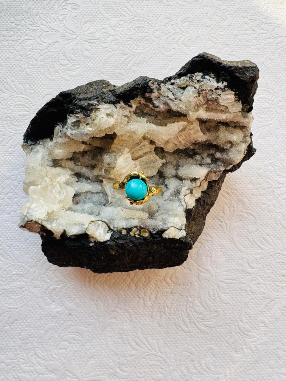 This exquisite handcrafted ring features a smooth turquoise gemstone set in warm golden brass. The organic design and open band allow a comfortable fit for any finger, making it both stylish and versatile. Each ring is individually made by skilled artisans in India, celebrating the timeless harmony of brass and natural stones.