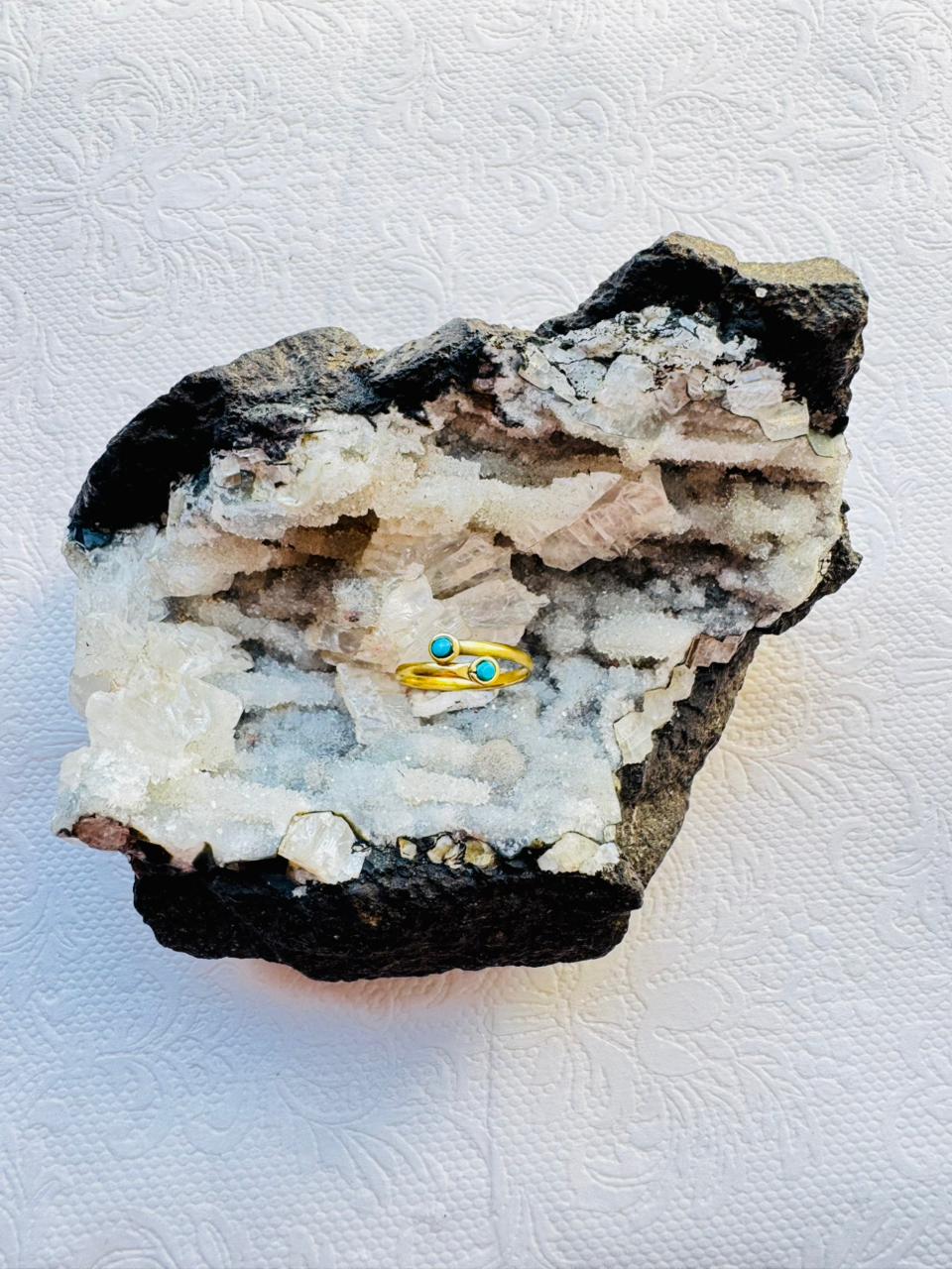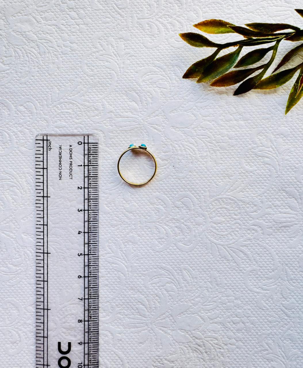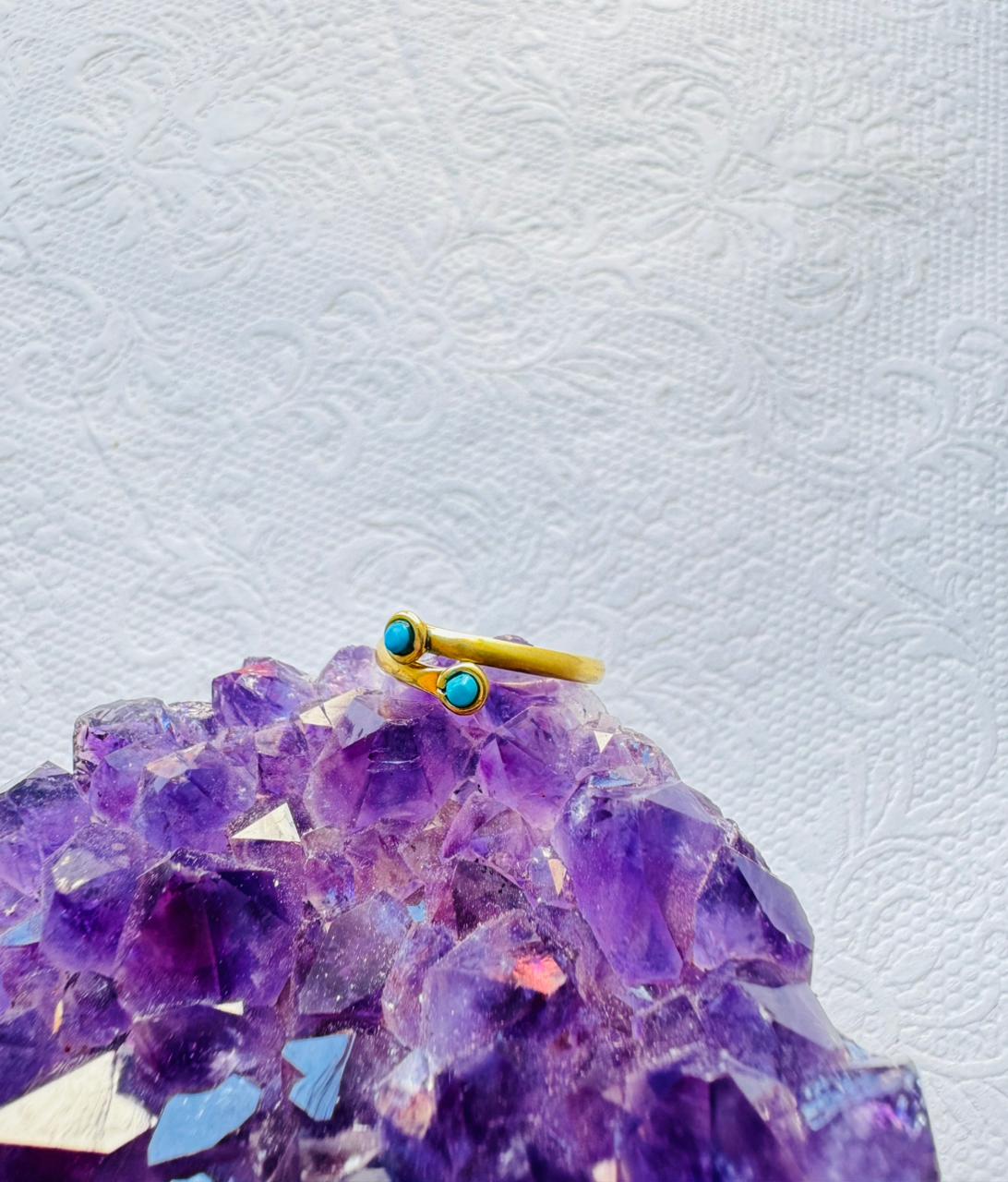 A gold-colored bypass ring featuring two small, round turquoise cabochons set at the ends of an overlapping band.
