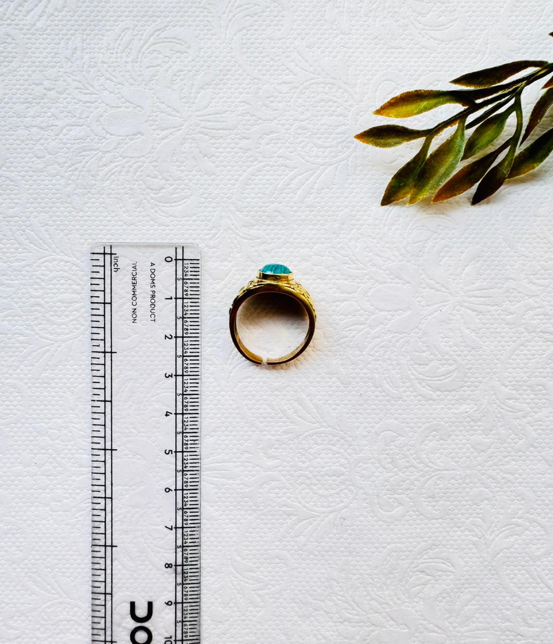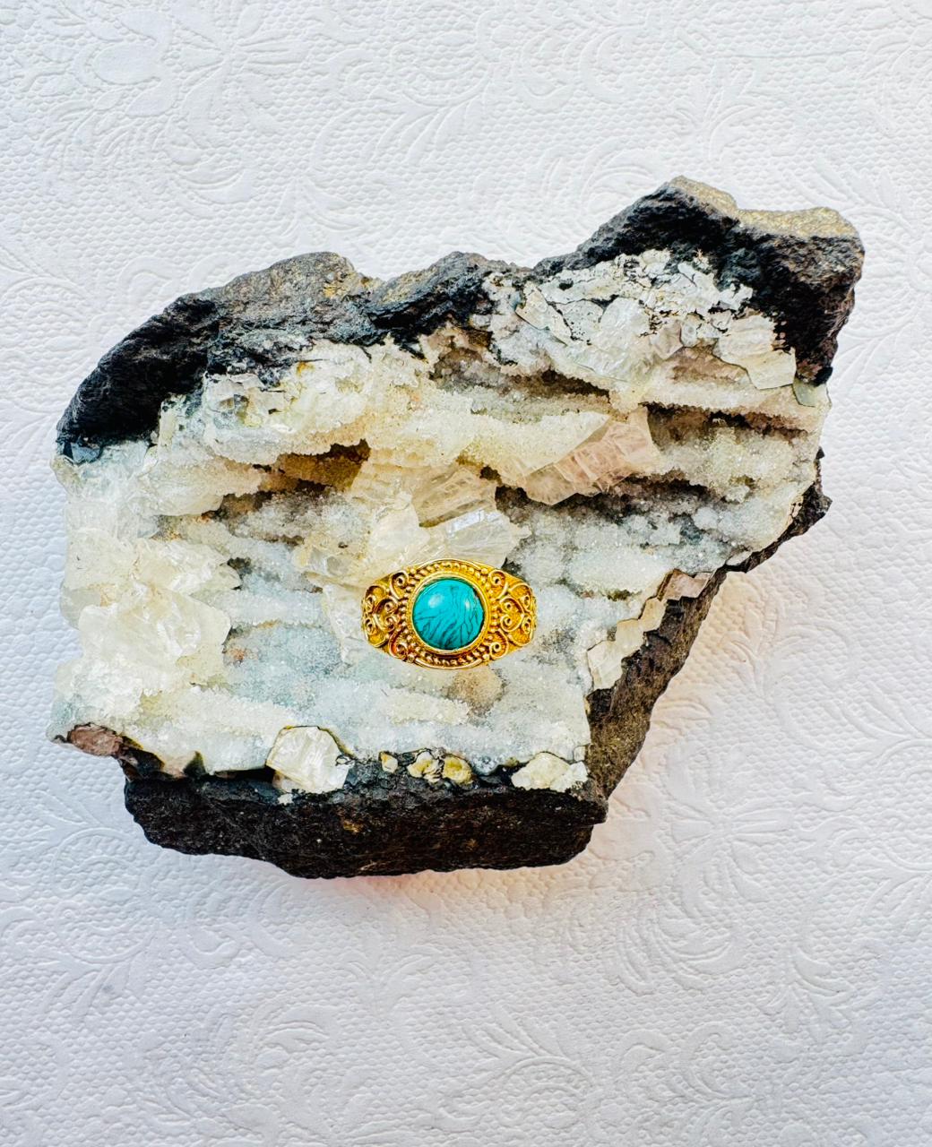 This striking brass ring features a detailed filigree design with a round turquoise stone at its center, creating a perfect blend of vintage and bohemian charm. The brass is hand-polished for a warm, antique finish, while the turquoise adds a touch of vibrant blue-green energy associated with protection and healing.