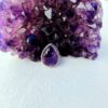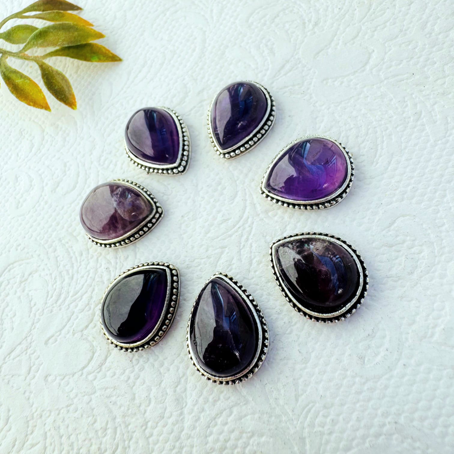 These handcrafted teardrop brass grooves feature polished amethyst cabochons with a deep violet hue, beautifully framed by detailed beaded brass borders. Each groove showcases a slightly unique shade and reflection due to the natural variation of the stone.