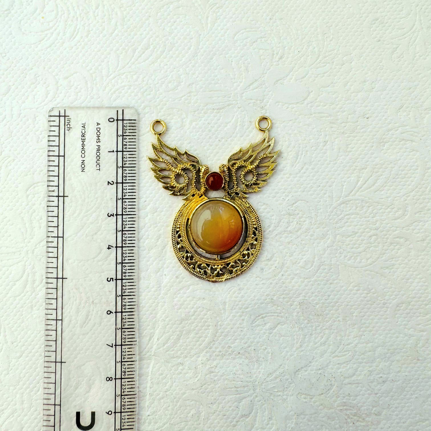 This beautiful brass pendant showcases intricate artistry with a symmetrical winged design framing two striking onyx cabochons one small and one large. The detailed brass filigree and antique gold finish give the piece a refined, vintage aesthetic