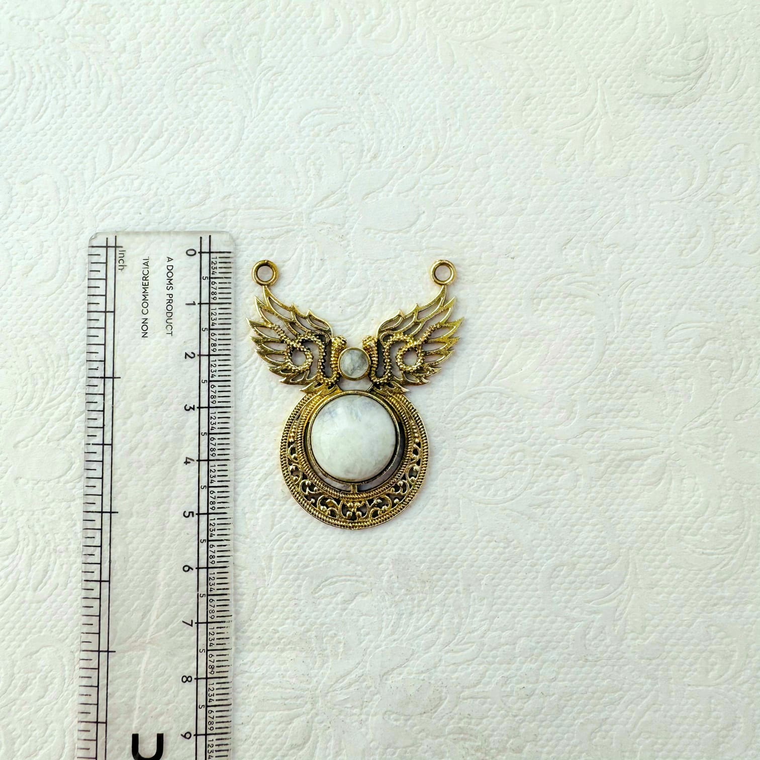 This beautiful brass pendant showcases intricate artistry with a symmetrical winged design framing two striking moonstone cabochons one small and one large. The detailed brass filigree and antique gold finish give the piece a refined, vintage aesthetic
