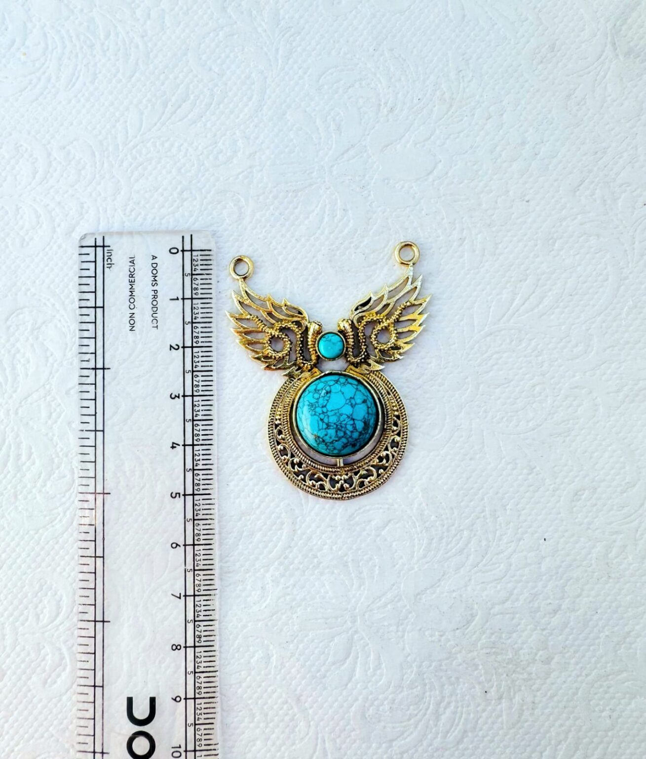 This beautiful brass pendant showcases intricate artistry with a symmetrical winged design framing two striking turquoise cabochons one small and one large. The detailed brass filigree and antique gold finish give the piece a refined, vintage aesthetic
