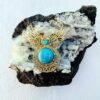 This beautiful brass pendant showcases intricate artistry with a symmetrical winged design framing two striking turquoise cabochons one small and one large. The detailed brass filigree and antique gold finish give the piece a refined, vintage aesthetic